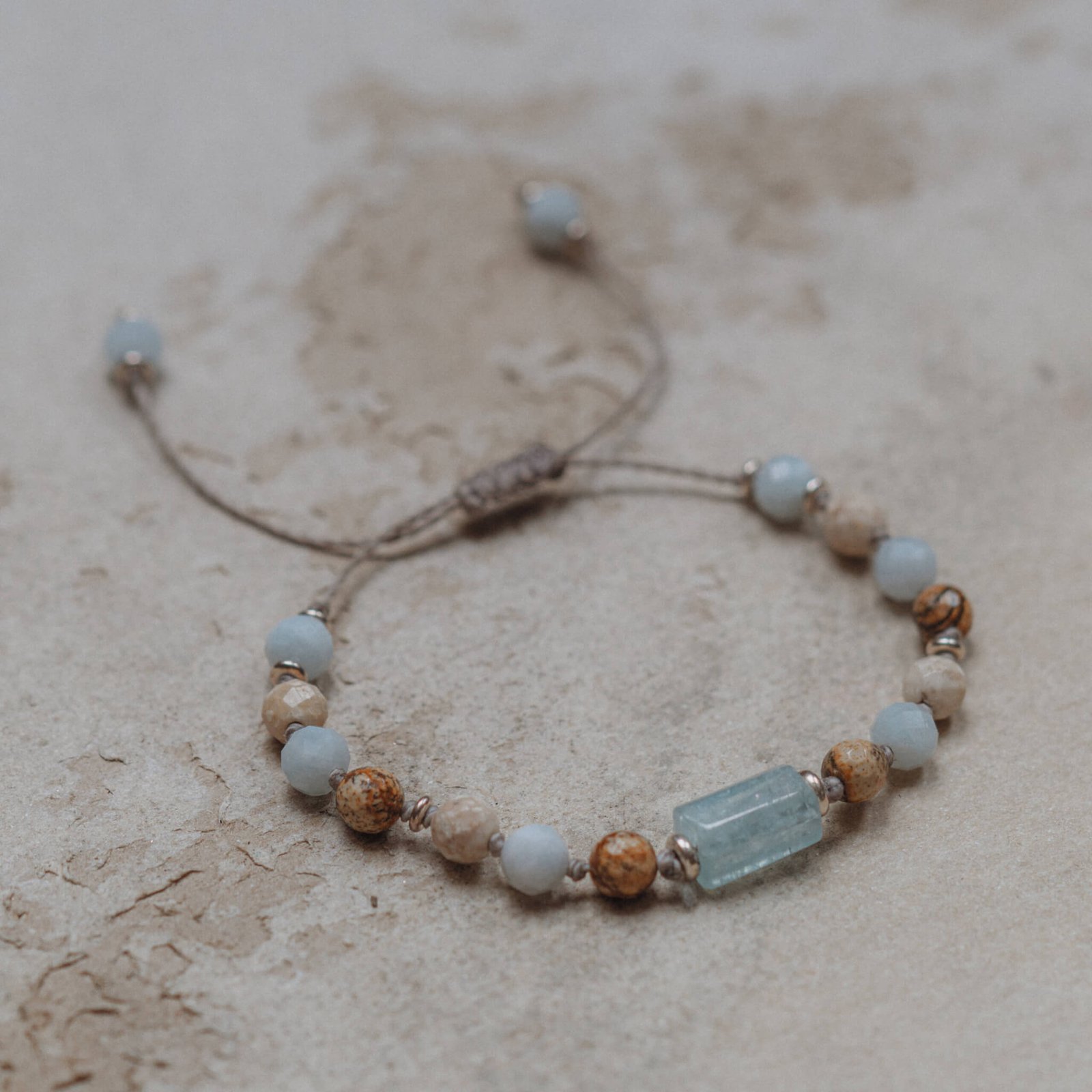 Farbgebung? Erdige Beige-, Braun-, Grau- und Wasserblautöne. Dieses Aquamarin-Armband ist eine zarte, handgefertigte Geschichte über inneren Frieden.