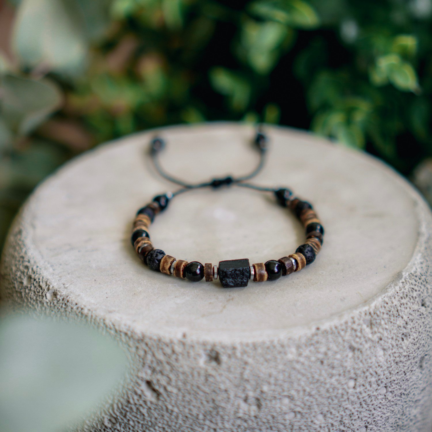 Das Armband aus Schwarzem Turmalin, Vulkanlava, Hämatit und Holz vereint natürliche Materialien mit unterschiedlichen Eigenschaften. Schwarzer Turmalin schützt vor negativen Energien, Vulkanlava symbolisiert Wiedergeburt und Stärke, Hämatit stabilisiert die Energie und Holz verleiht natürlichen Charme.