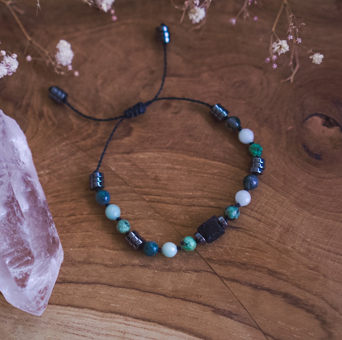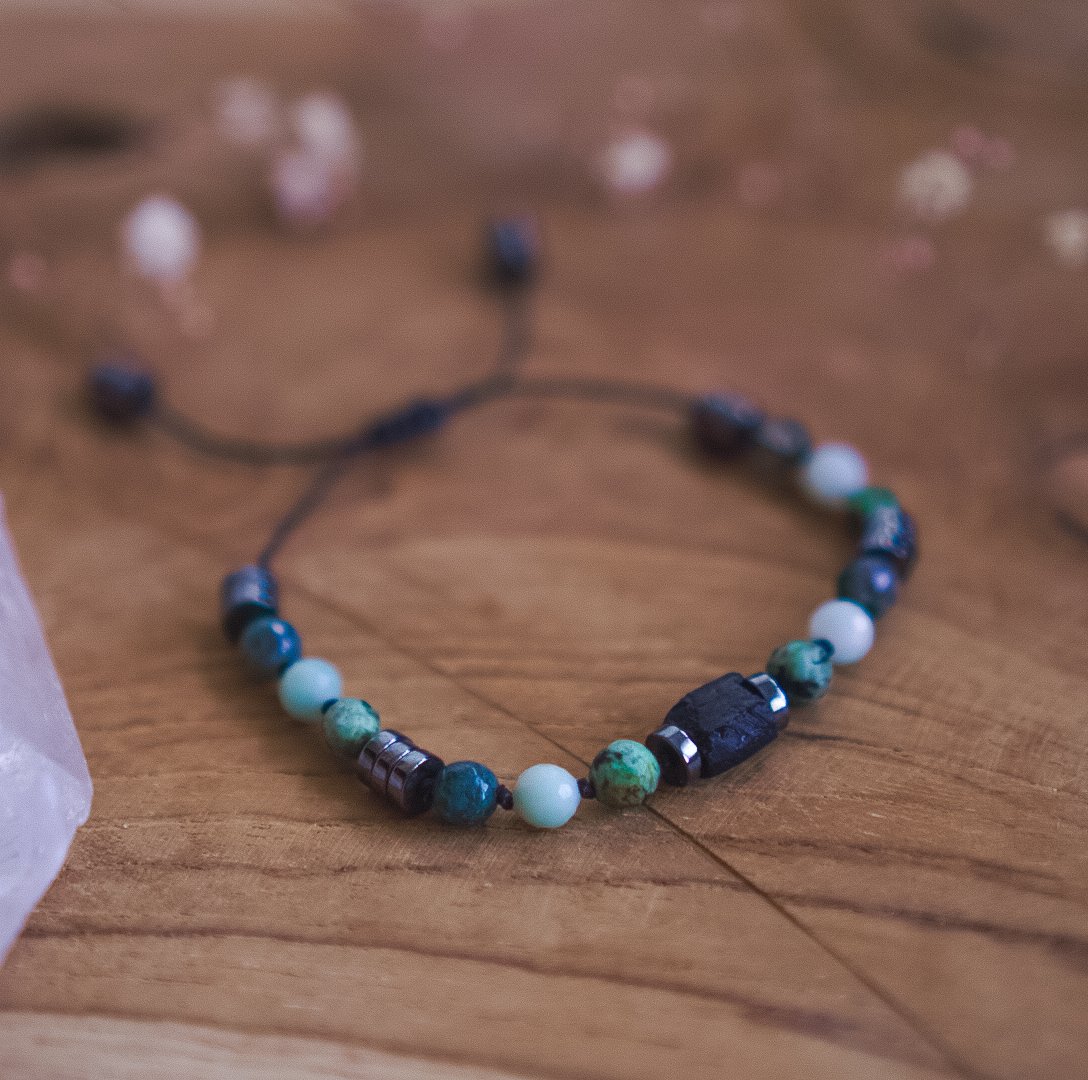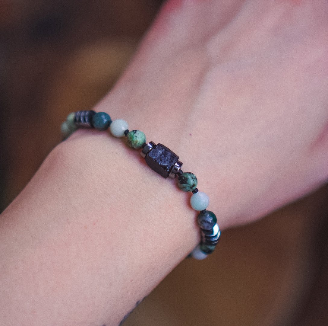 Wunderschönes Armband mit fünf Steinen: Schwarzer Turmalin, Afrikanischer Türkis, Amazonit, Moosachat und Hämatit. Für Harmonie, Stärke und positive Energie.