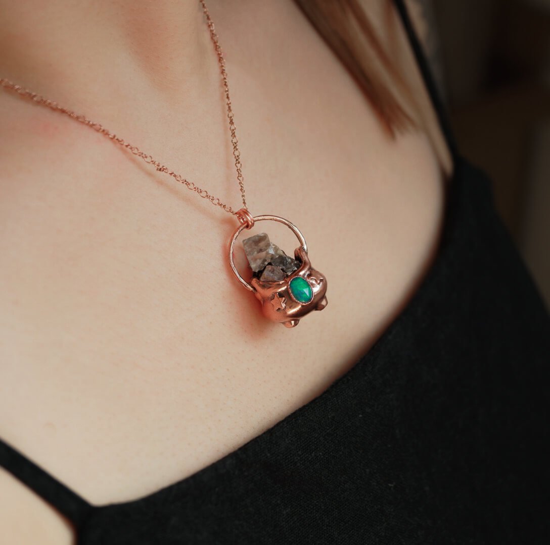 Diese einzigartige Kessel-Halskette aus Kupfer birgt rohen Fluorit und äthiopischen Opal, die zusammen eine magische Komposition voller natürlicher Energie bilden. Jeder Stein wurde aufgrund seiner einzigartigen Eigenschaften ausgewählt, die Harmonie und Balance anziehen.