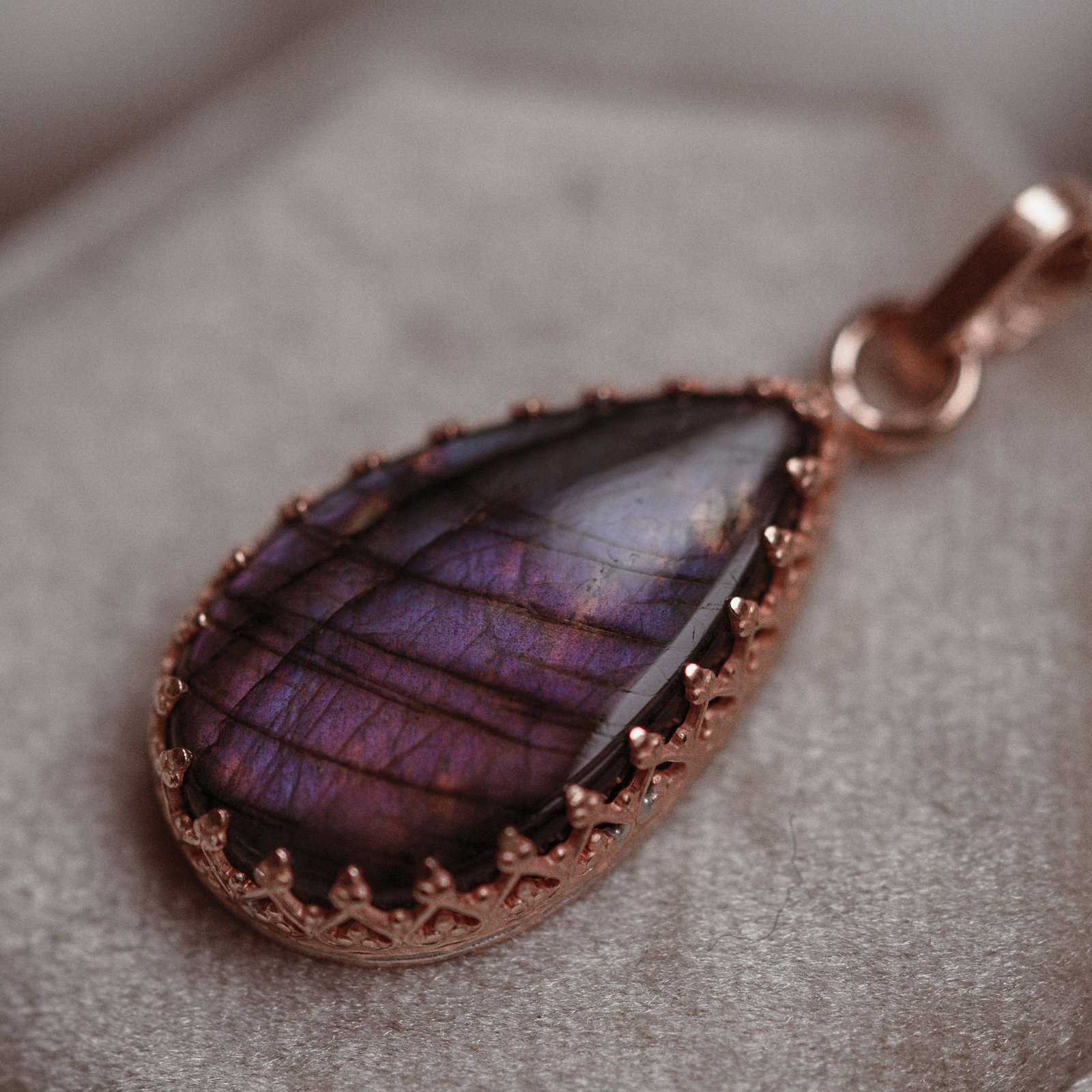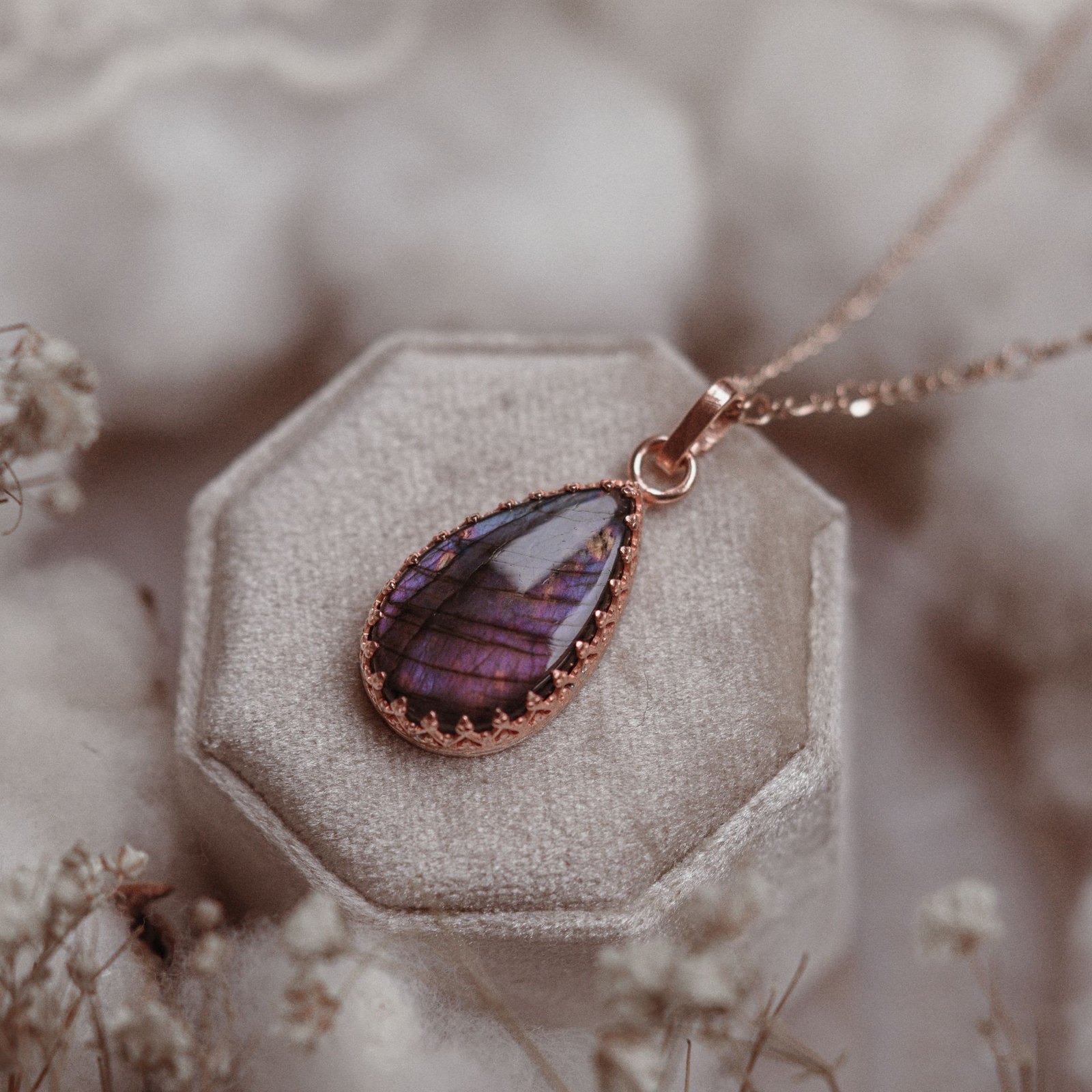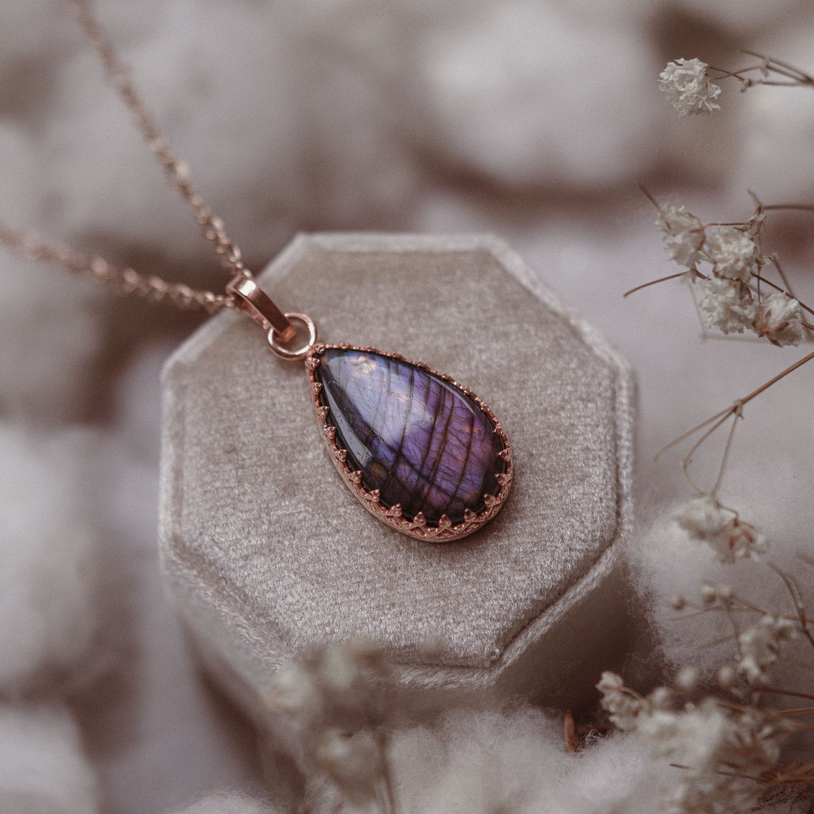 Kupferhalskette mit lila Labradorit in Tropfenform. Handgefertigt, mit klarem Labradorit und einer zarten, leichten Fassung.