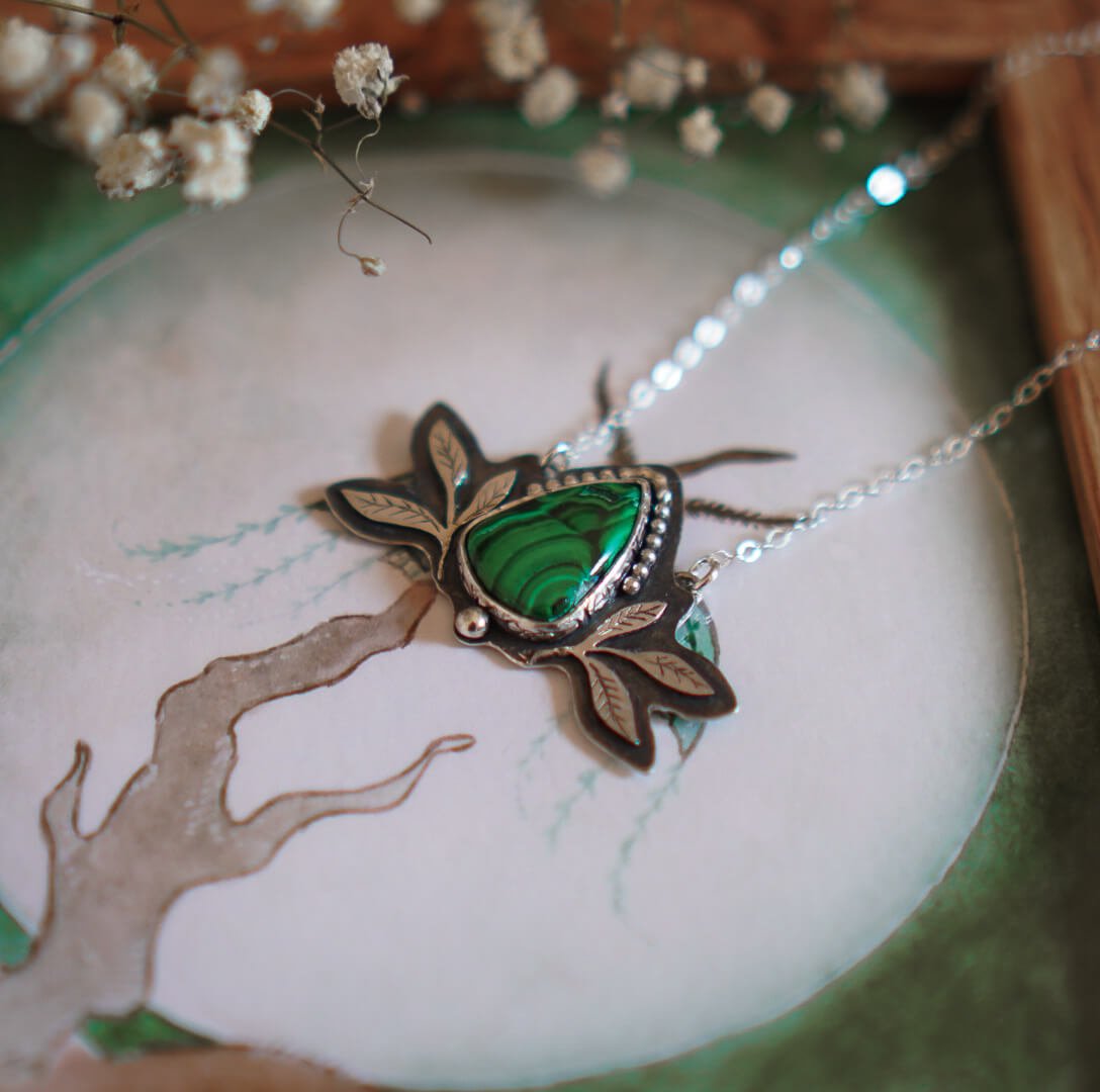 Entdecke eine einzigartige Malachit-Halskette, die Eleganz mit natürlicher Schönheit verbindet. Gefertigt aus hochwertigem Silber, ist die Halskette mit einem Blattmotiv verziert, dessen Herzstück ein tiefgrüner Malachit bildet. Die zarten Blätter um den Stein verleihen dem Schmuckstück Eleganz, perfekt für den Alltag sowie für besondere Anlässe.