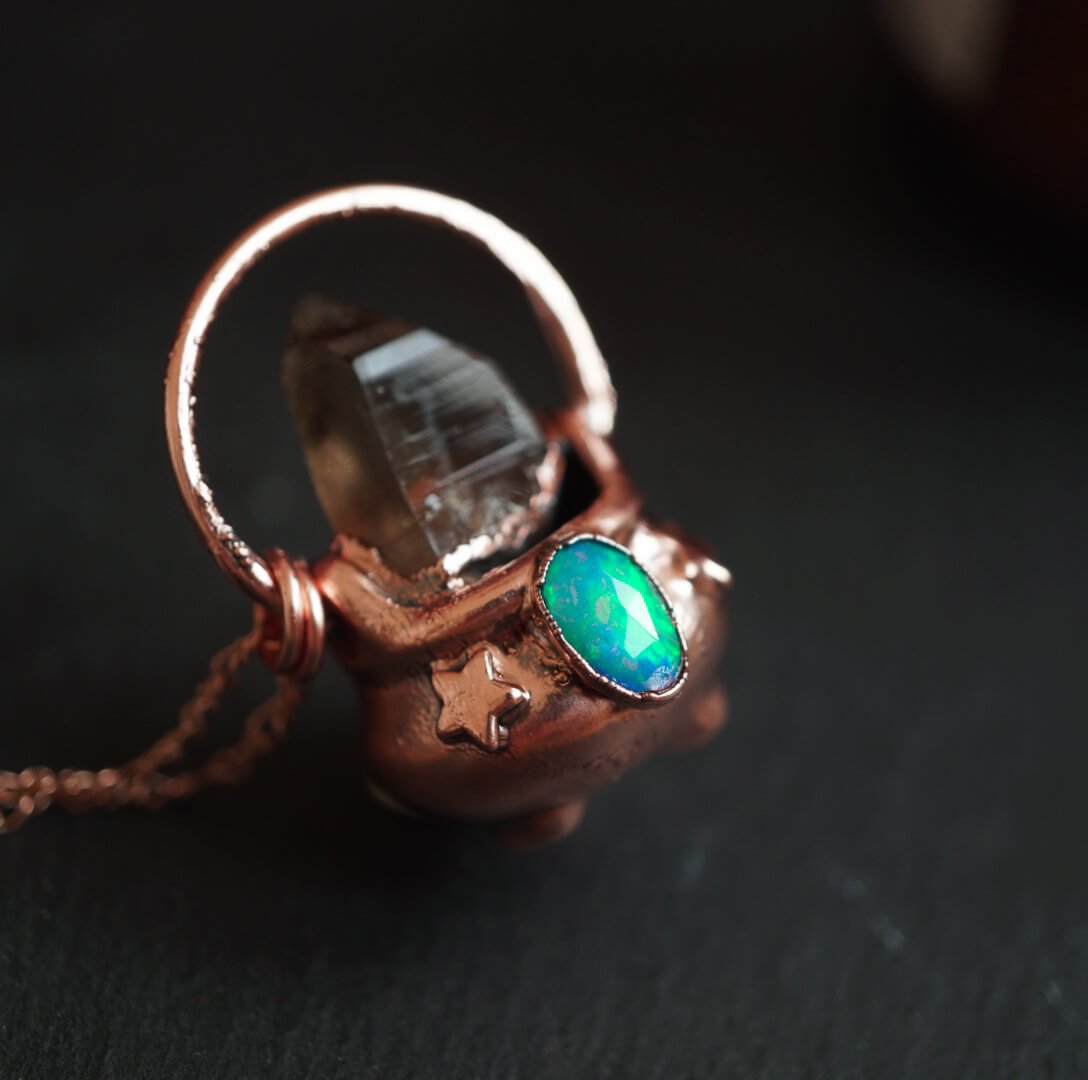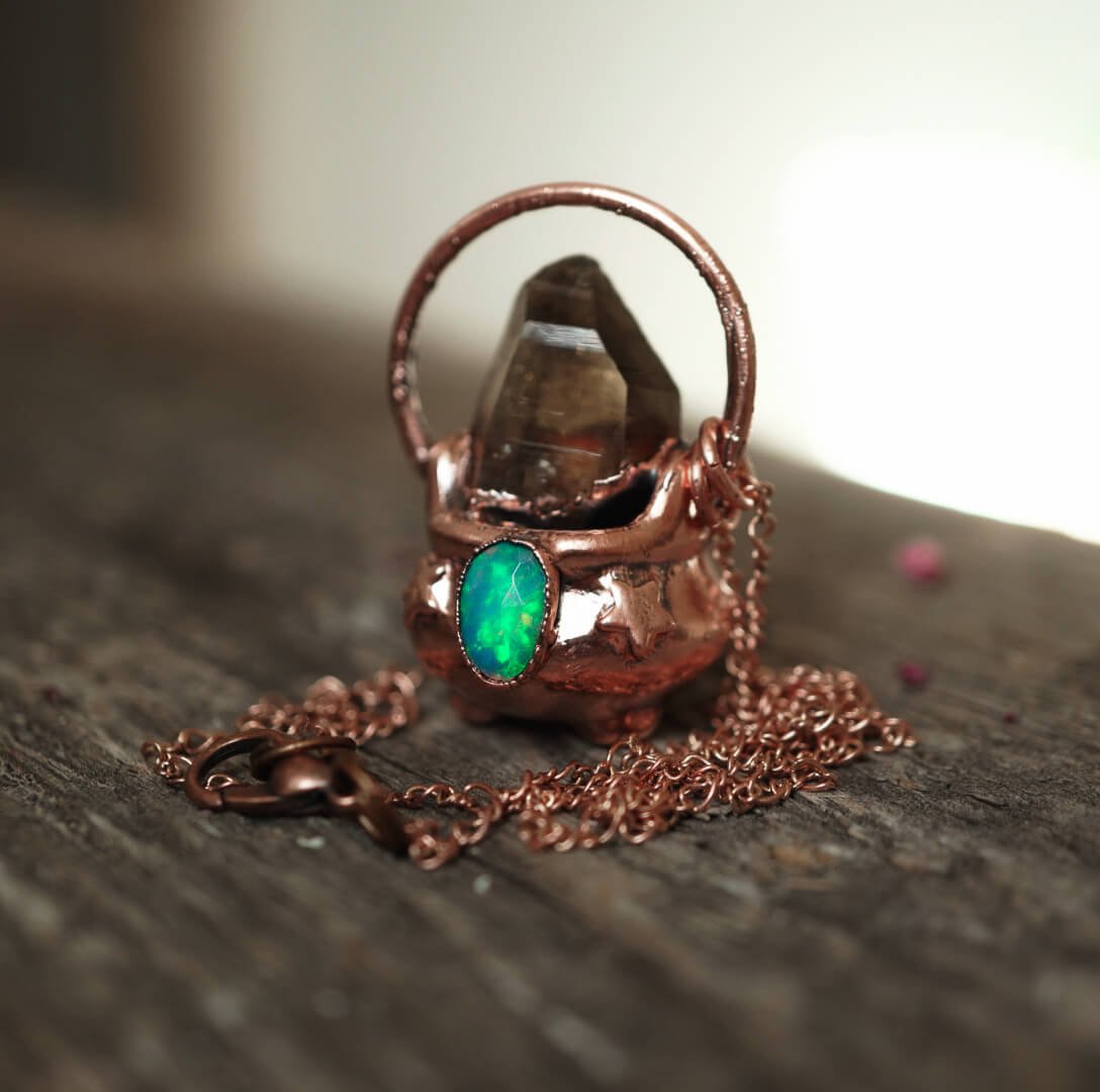 Hexenkessel-Halskette mit Rauchquarz und Opal