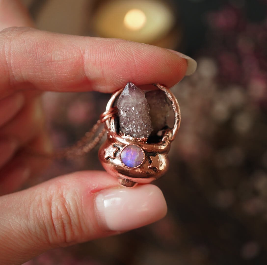 Diese einzigartige Halskette in Form eines Hexenkessels verbindet rohen Kaktusamethyst, der Gleichgewicht und Ruhe fördert, mit schillerndem Labradorit, der in blauen und grünen Reflexen strahlt. Das ideale Accessoire für Liebhaberinnen von Magie und Geheimnis!