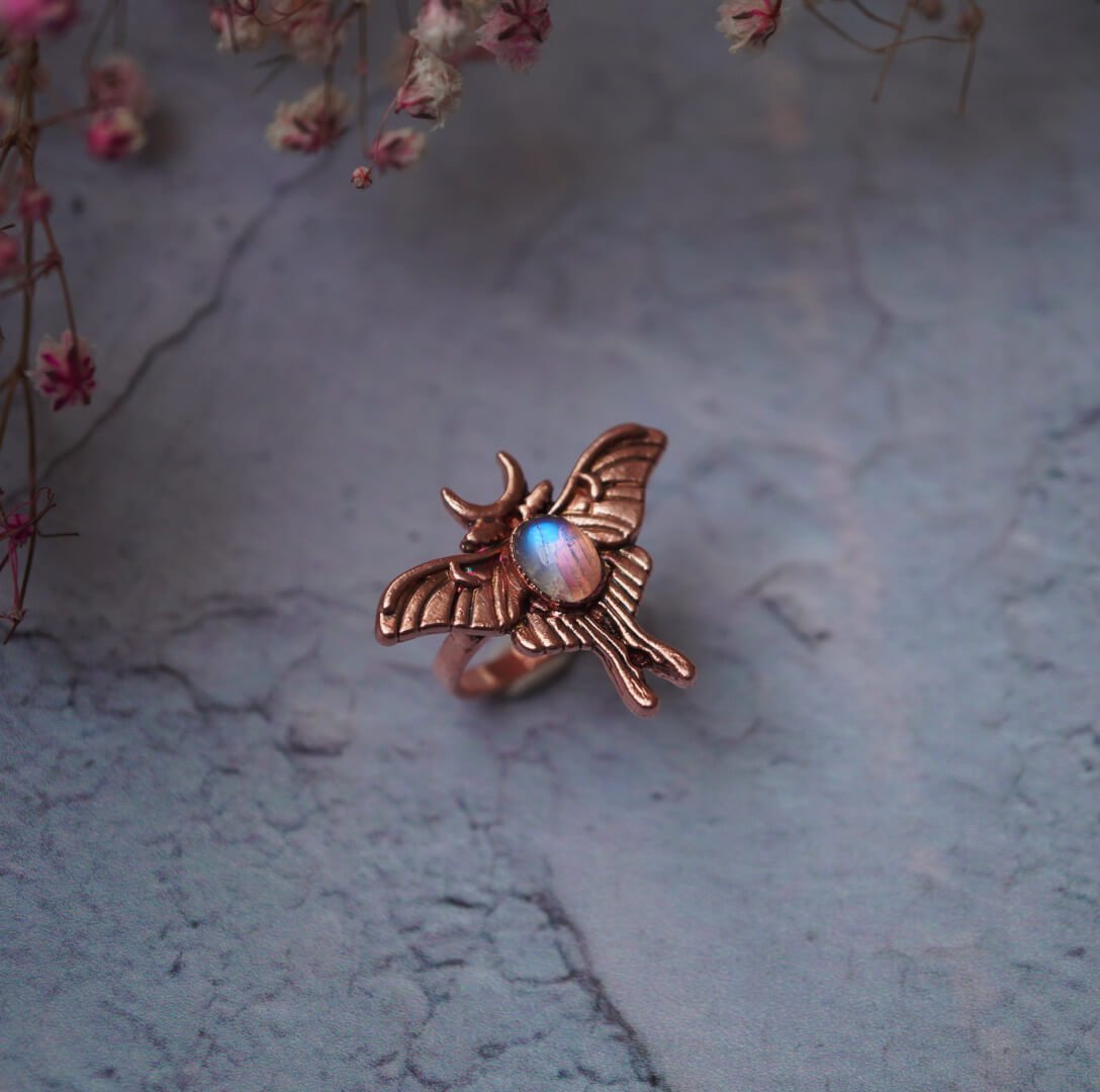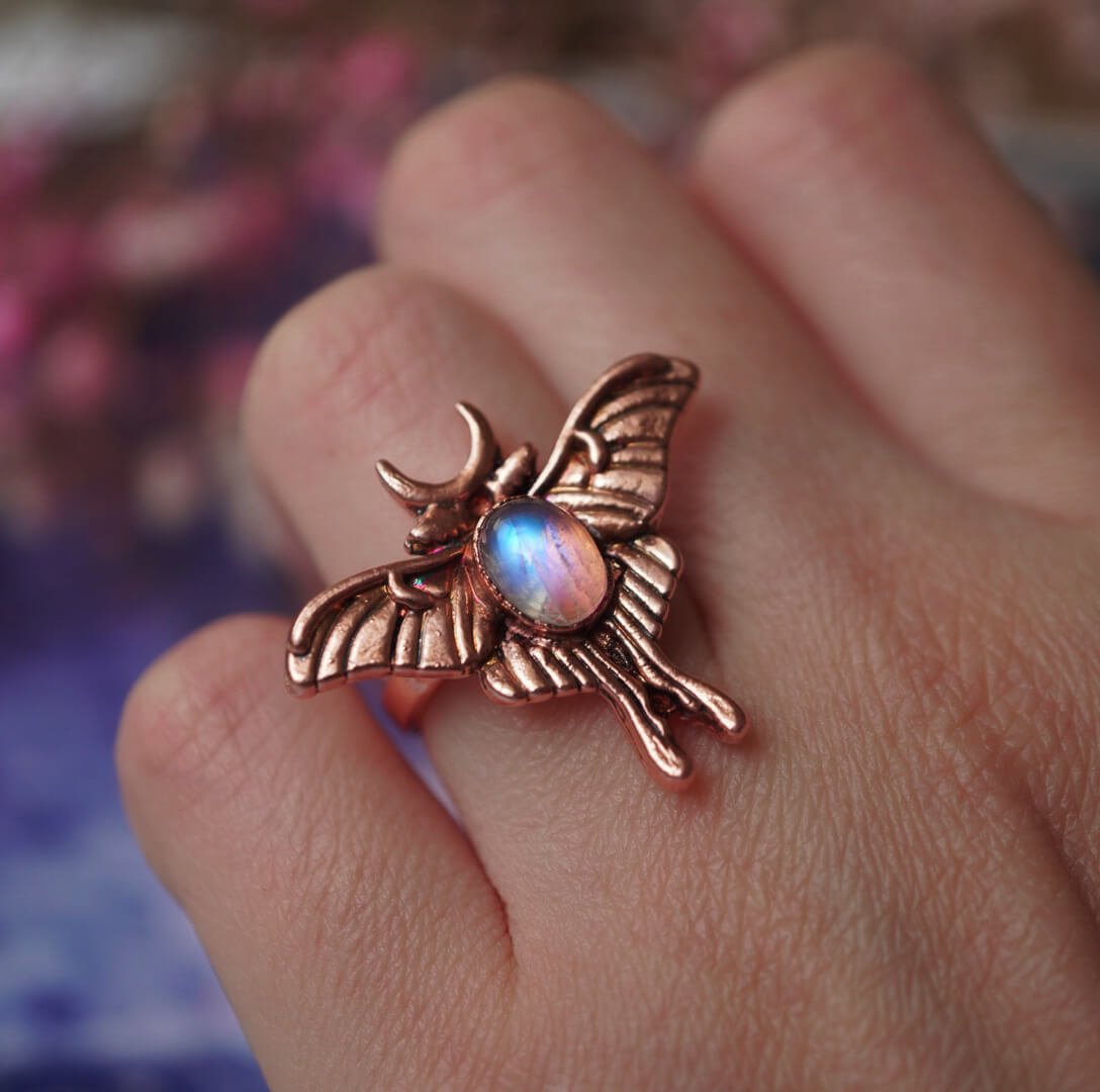 Dieser handgefertigte Ring zieht die Blicke auf sich durch die elegante Kombination aus Mottenmotiv und Mondstein, die einen subtilen, natürlichen Charme erzeugt. Der zarte Glanz des Mondsteins im Mittelpunkt verleiht dem Ring Tiefe, und seine opalisierenden Reflexe unterstreichen die Schönheit der Handwerkskunst. Ideal für den Alltag und besondere Anlässe, ist er ein bezauberndes Accessoire, das jedem Outfit einen Hauch von Magie verleiht.