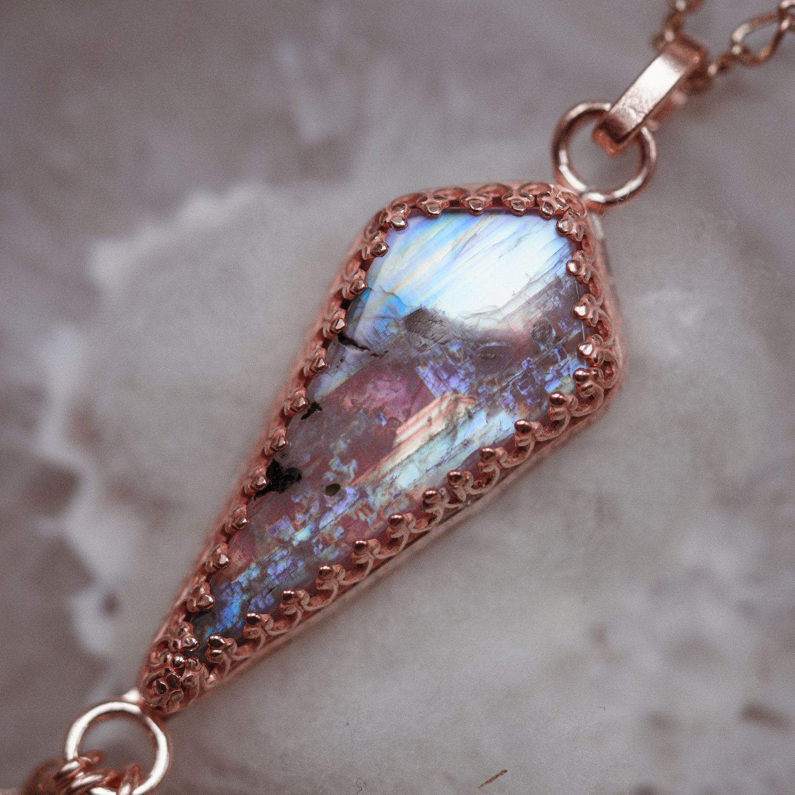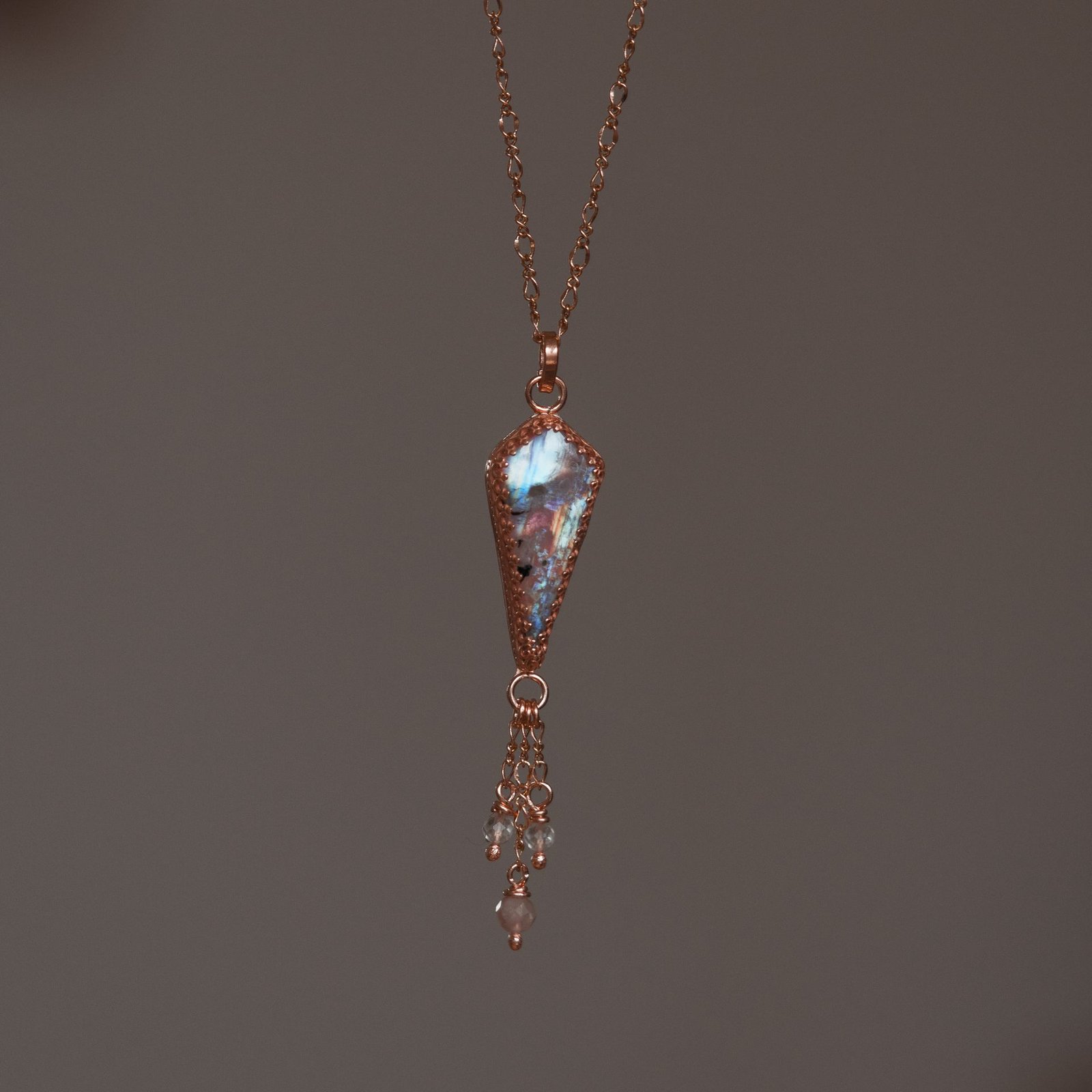 Kupferkette mit einem Mondstein in der Mitte, der durch facettierte Rosenquarz- und Bergkristallperlen ergänzt wird. Handgefertigt, ein einzigartiges Stück.