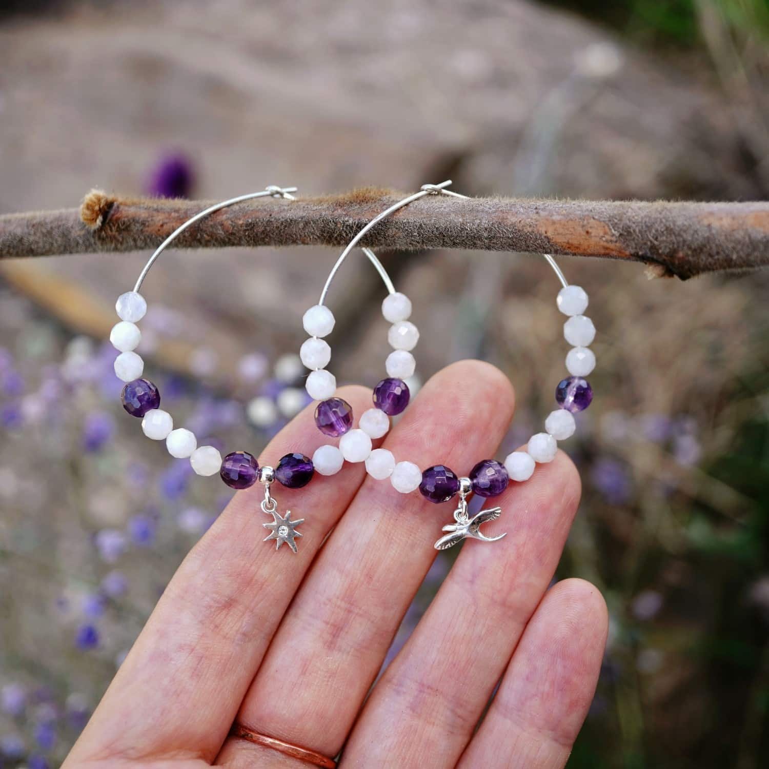 Die Nachtgeheimnisse-Ohrringe verbinden Amethyst und Mondstein und bilden ein schützendes Duo für Intuition, Ruhe und tiefe Gelassenheit.