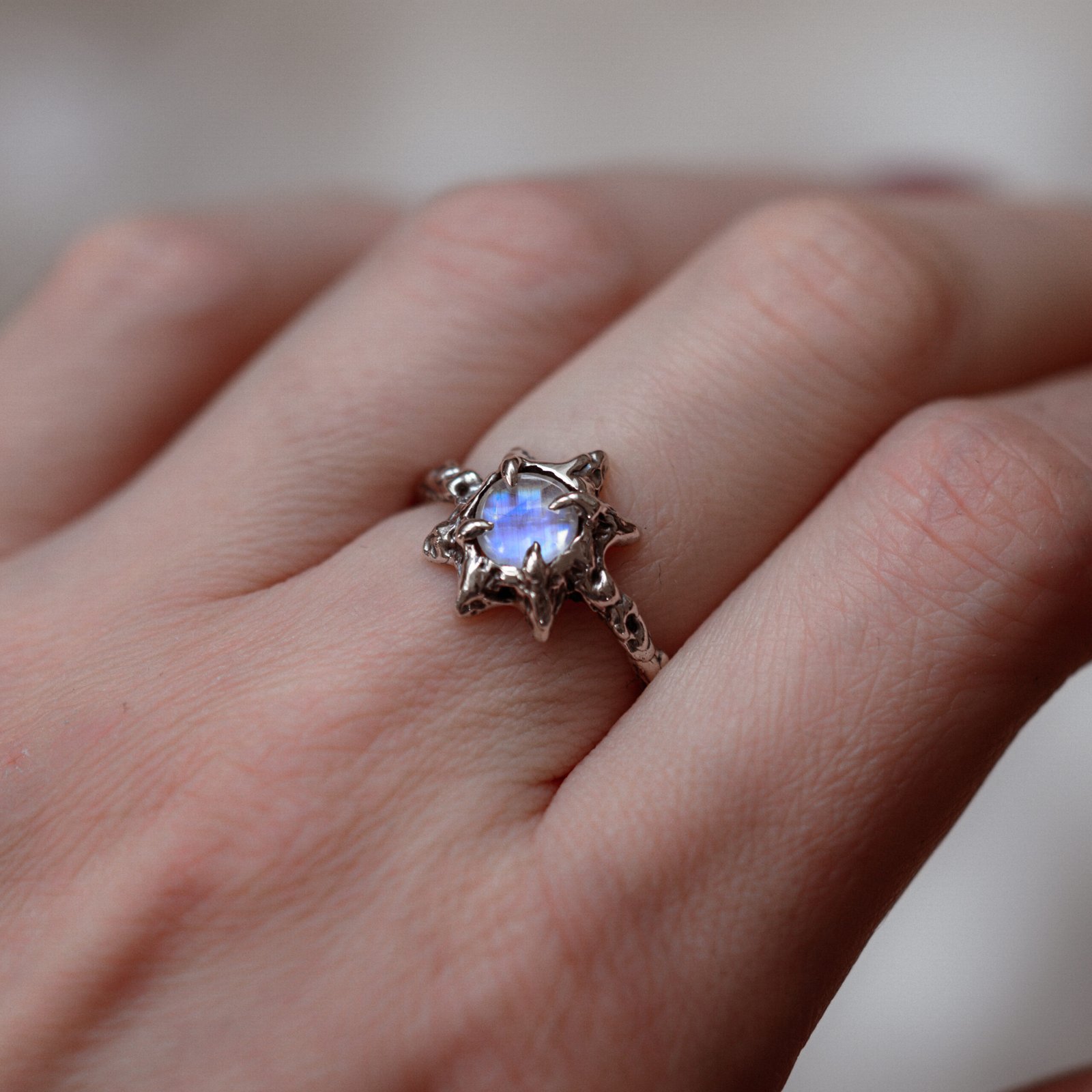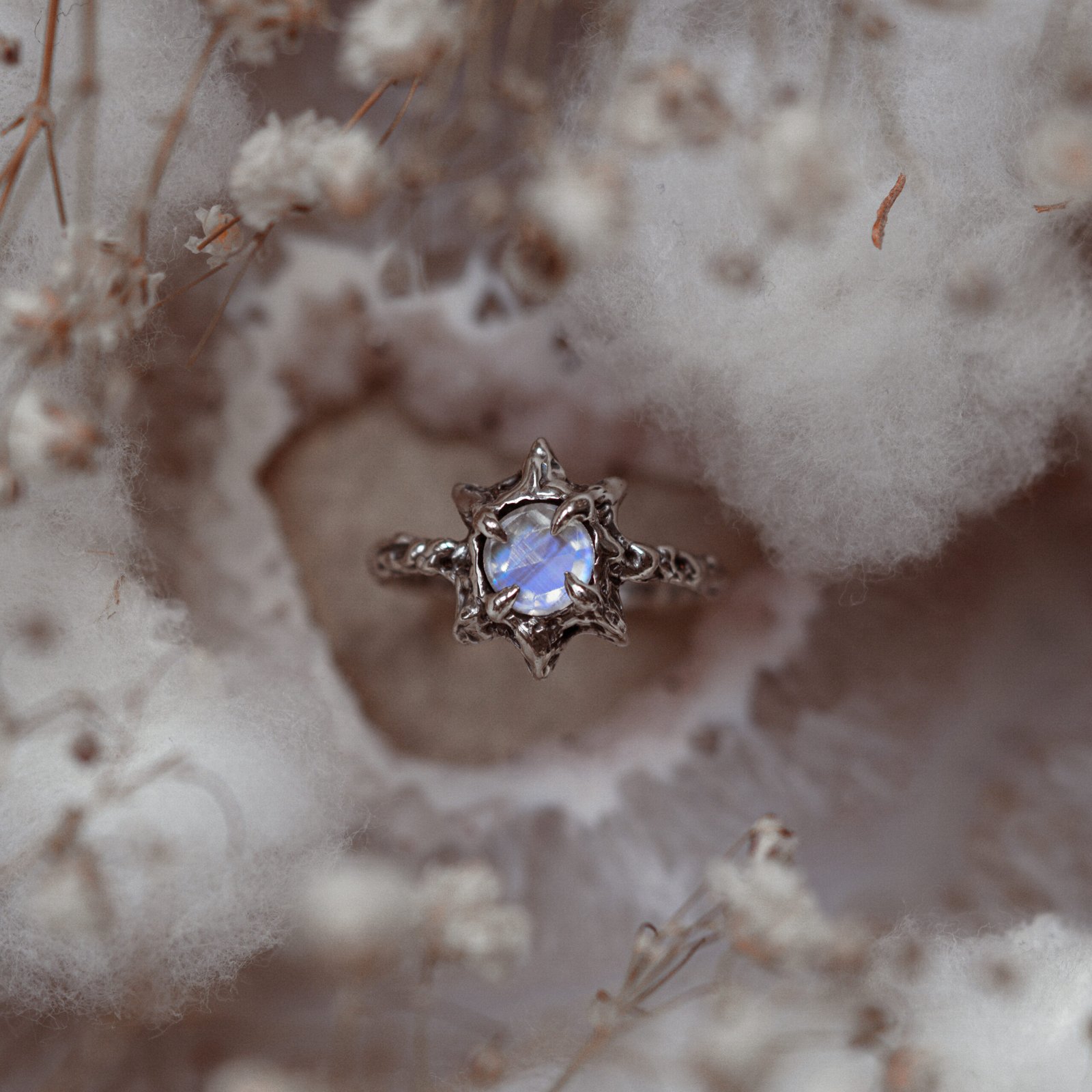 Der Silberring Mondstein „Sternentropfen“ ist ein Schmuckstück, das keinen Zwilling hat. Er entstand nur einmal — genau in dieser Form, aus diesem Wachs, aus dieser Geste.