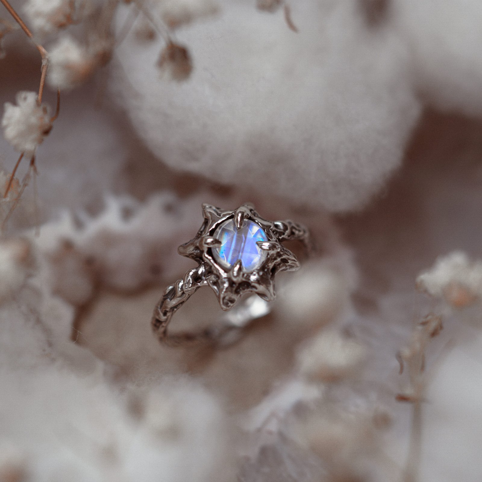 Im Zentrum der Fassung glänzt ein Mondstein, der gerne überrascht. In einem Moment leuchtet er in kühlem Blau, einen Augenblick später wechselt er zu einem rosa oder violetten Schimmer. Er reagiert auf die Bewegung deiner Hand und das Licht, daher lebt der Ring mit dir. Mondstein wird seit langem mit Ruhe und Intuition assoziiert — deshalb tragen ihn viele Menschen als kleinen Talisman, der Sanftheit und Gleichgewicht verleiht.
