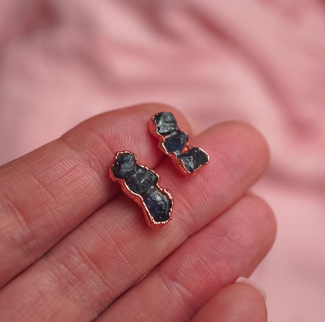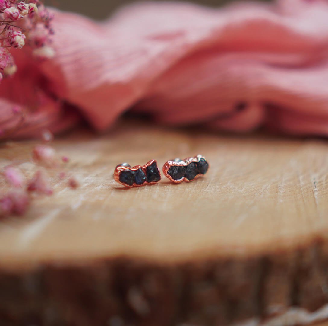 Diese Ohrstecker vereinen die natürliche Schönheit des Rohsaphirs mit dem rustikalen Charme von Kupfer. Jeder Stein wurde von Hand in eine Kupferfassung gesetzt, die seinen natürlichen Look und seine Authentizität unterstreicht.
