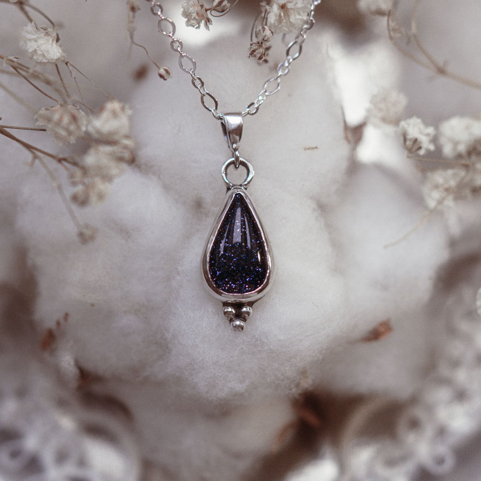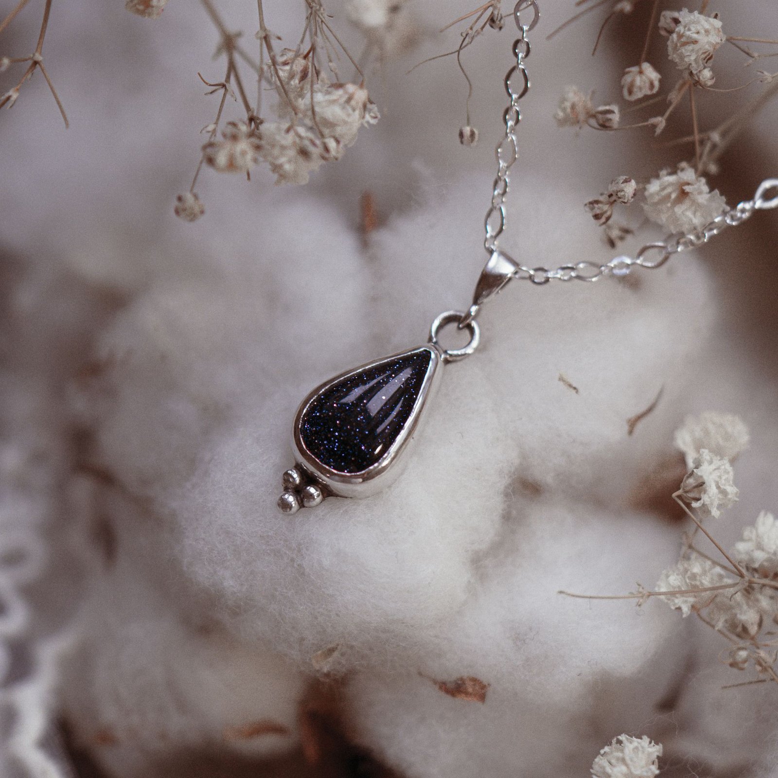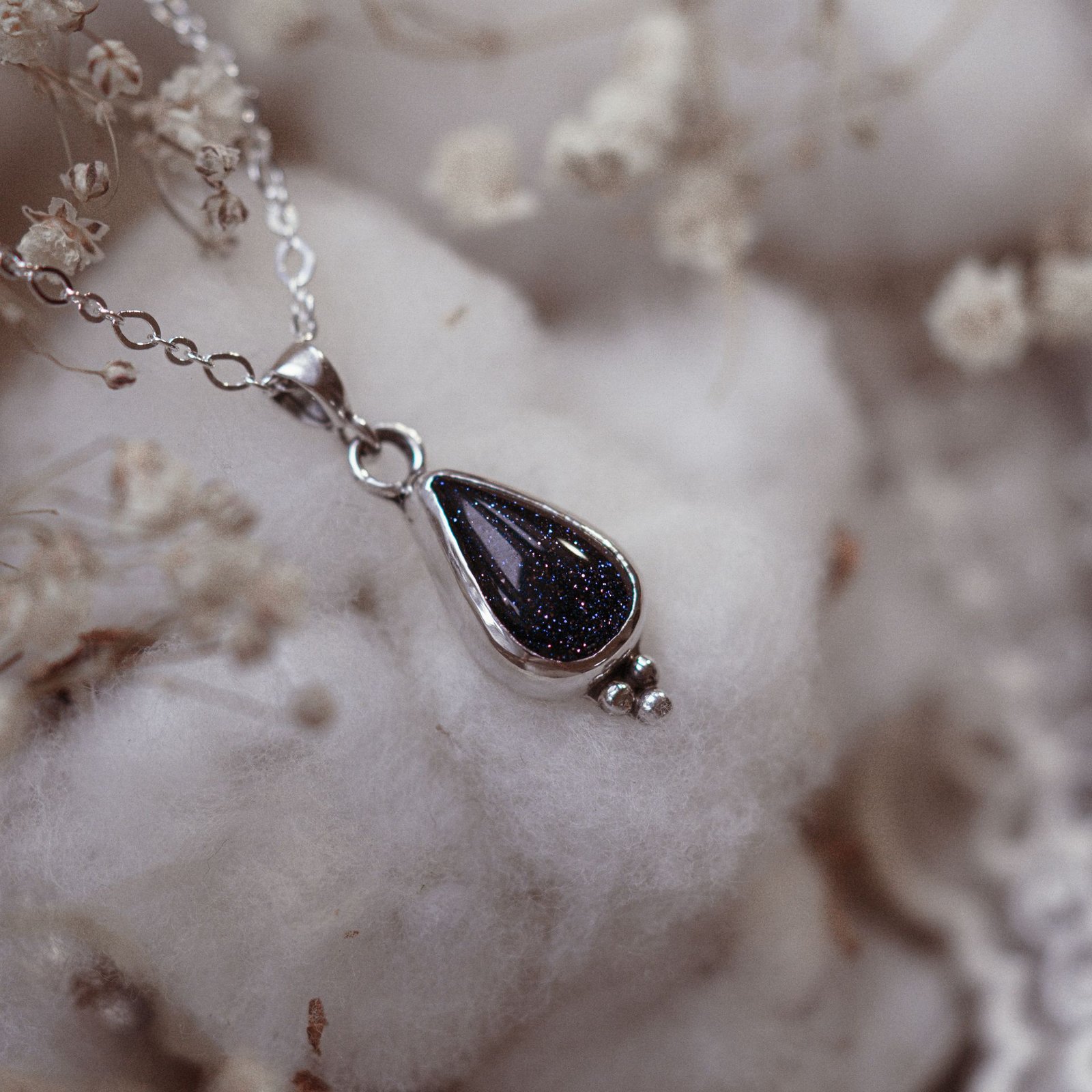 Diese Silberkette mit Kairo-Nacht ist ein zartes, handgefertigtes Schmuckstück, das erst aus der Nähe die Aufmerksamkeit auf sich zieht. Der Stein hat eine tiefe, dunkle Farbe, und die in seiner Struktur eingebetteten Partikel reflektieren das Licht mit einem subtilen, sternenartigen Glanz. Dadurch dominiert die Kette das Outfit nicht, sondern ergänzt es dezent.