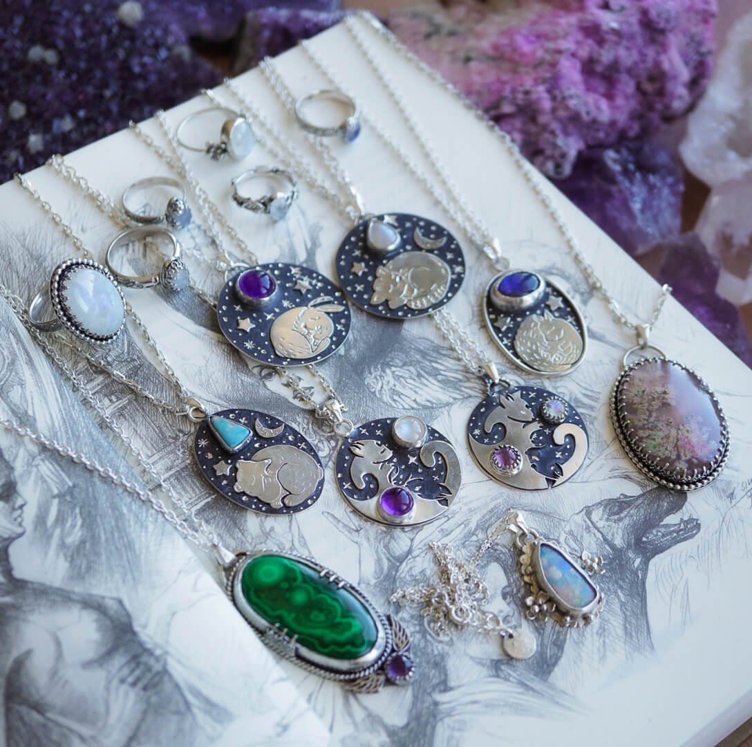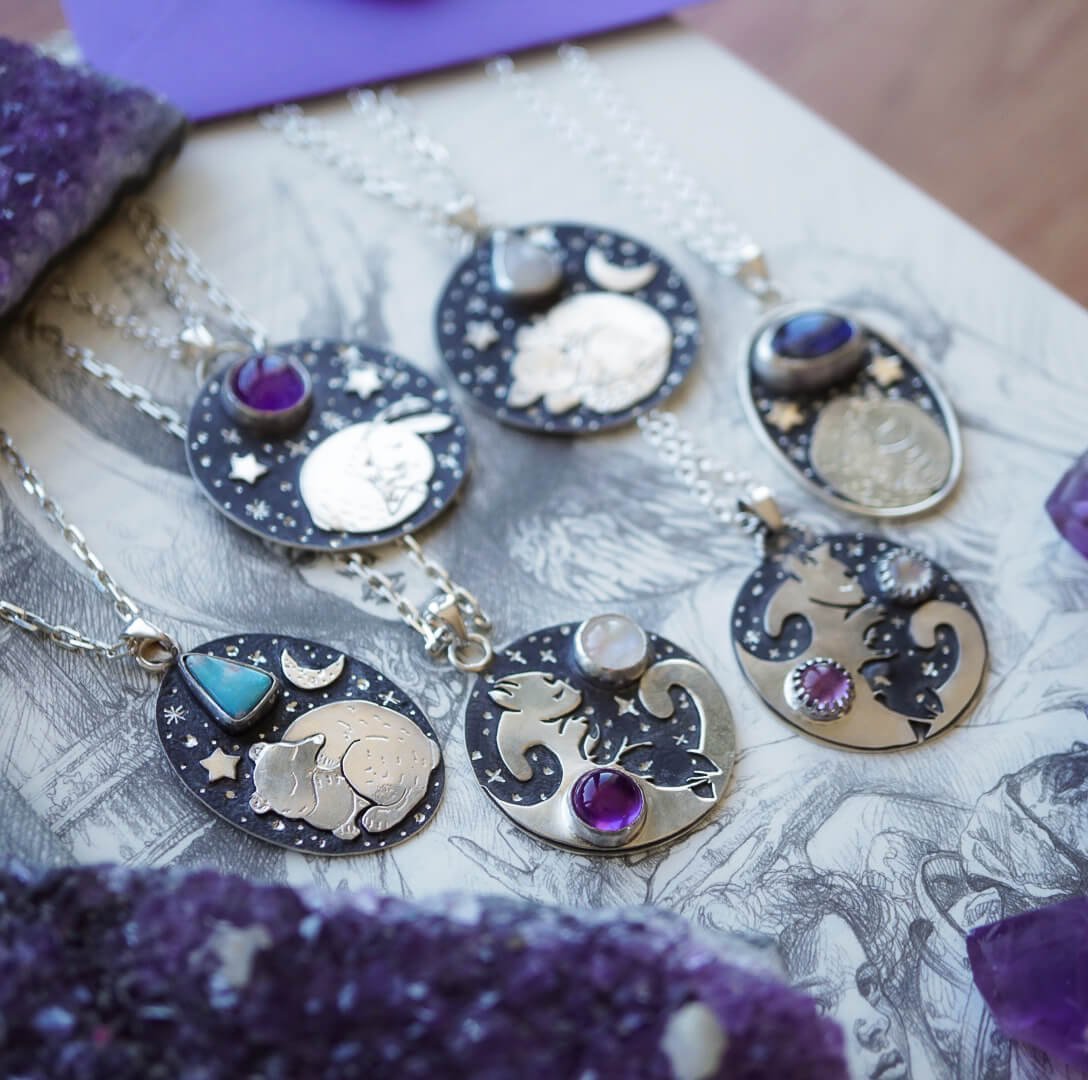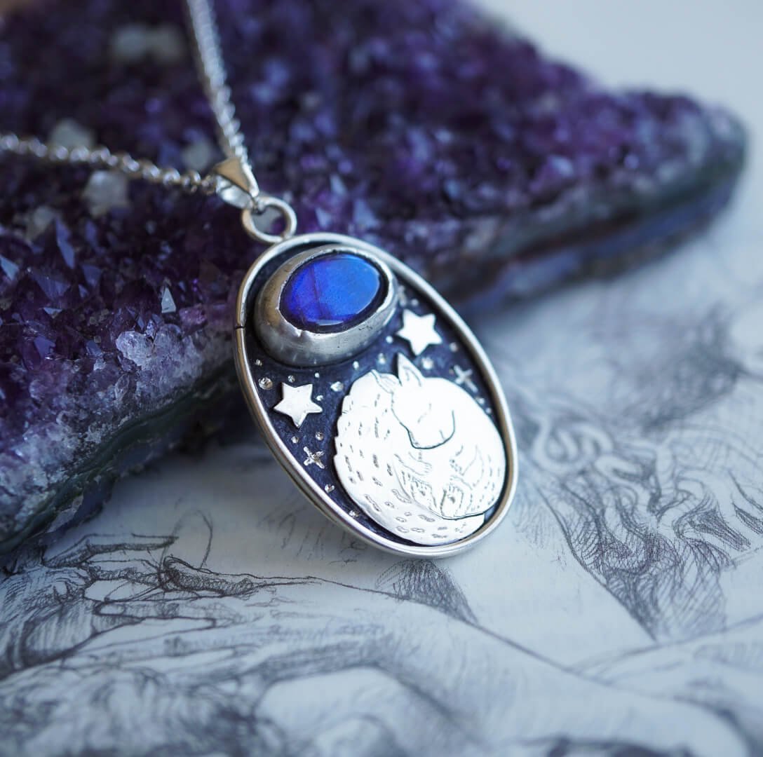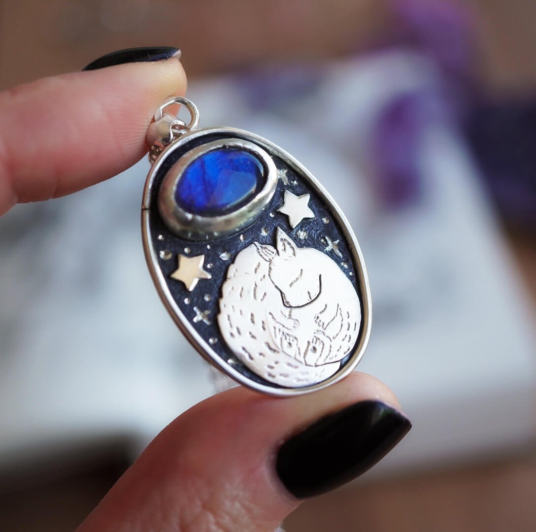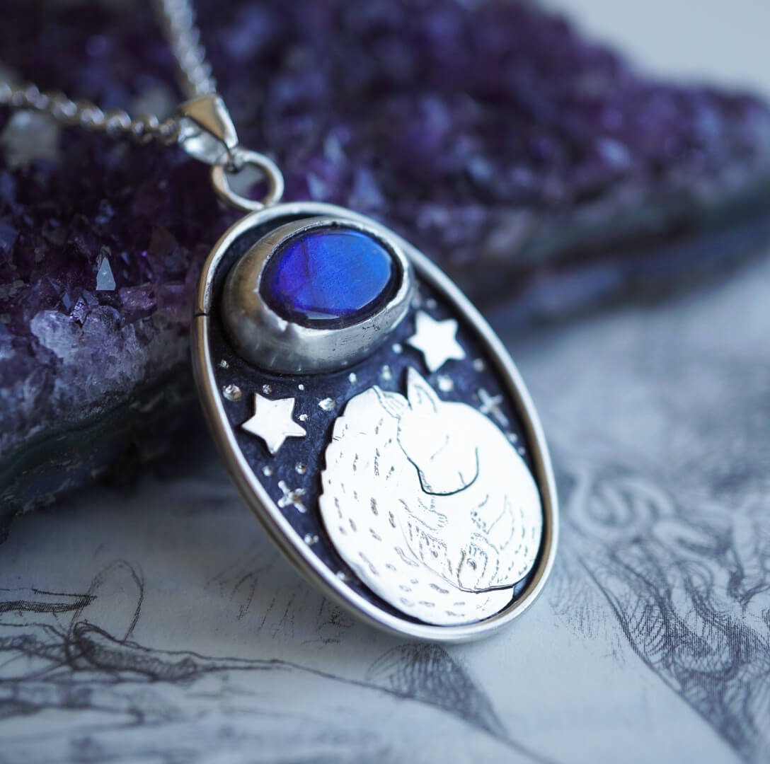 Tauche ein in den mystischen Charme des Nachthimmels mit unserer Halskette „Silberne Nacht„. Ihre Einzigartigkeit entsteht durch die Kombination von Silber mit dem blauen Schimmer des Labradorits und zarten Motiven, die sich auf die nächtliche Szenerie beziehen.