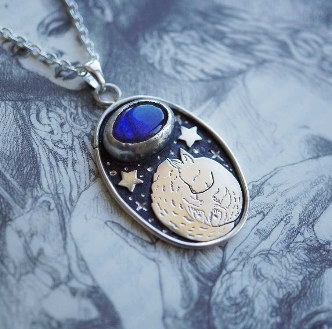 Das Motiv eines schlafenden Eichhörnchens, zart auf die Oberfläche des Silbermedaillons graviert, verleiht der Halskette Charme und Ruhe. Das Eichhörnchen, das Harmonie mit der Natur und einen Moment der Stille symbolisiert, harmoniert perfekt mit dem mystischen Glanz des Labradorits.