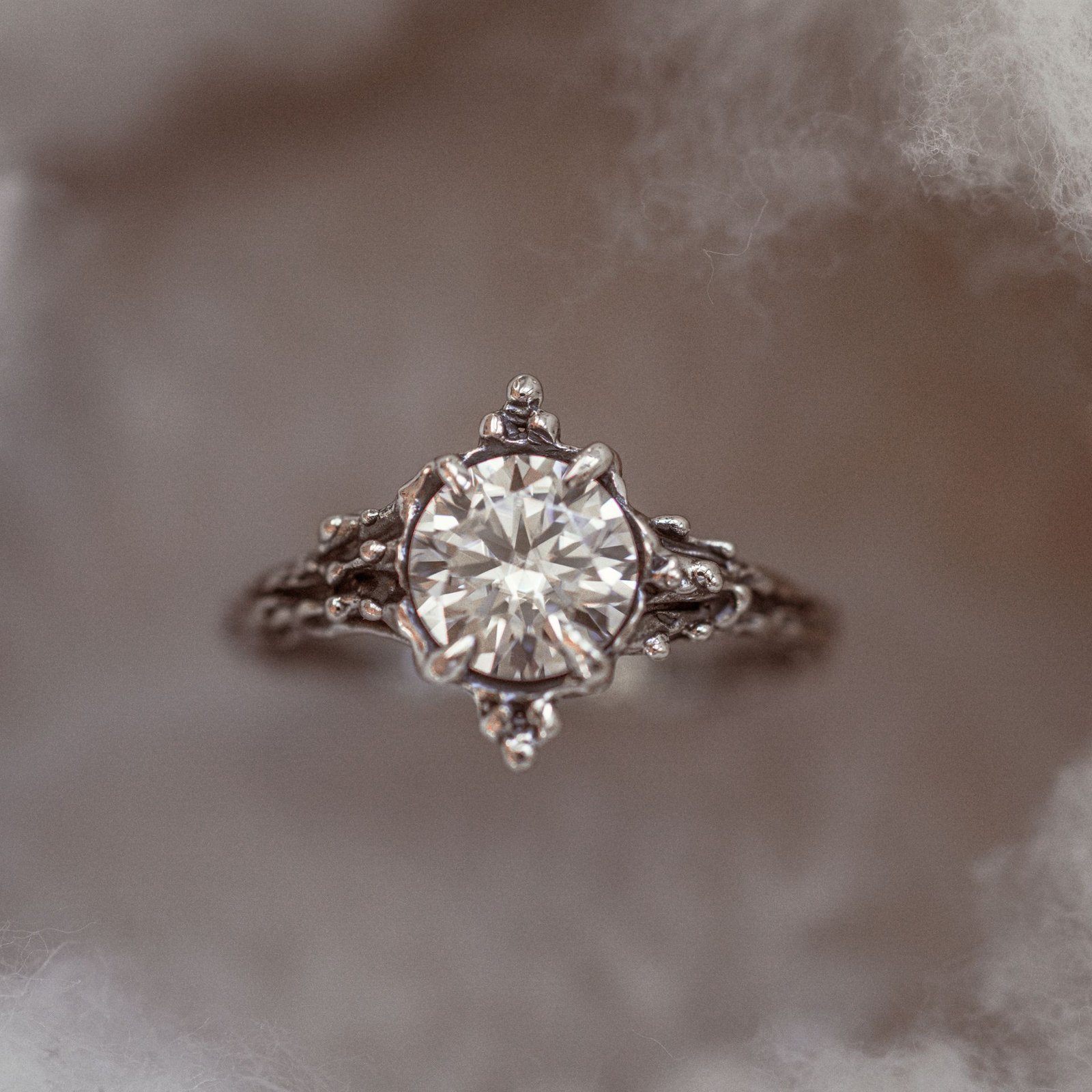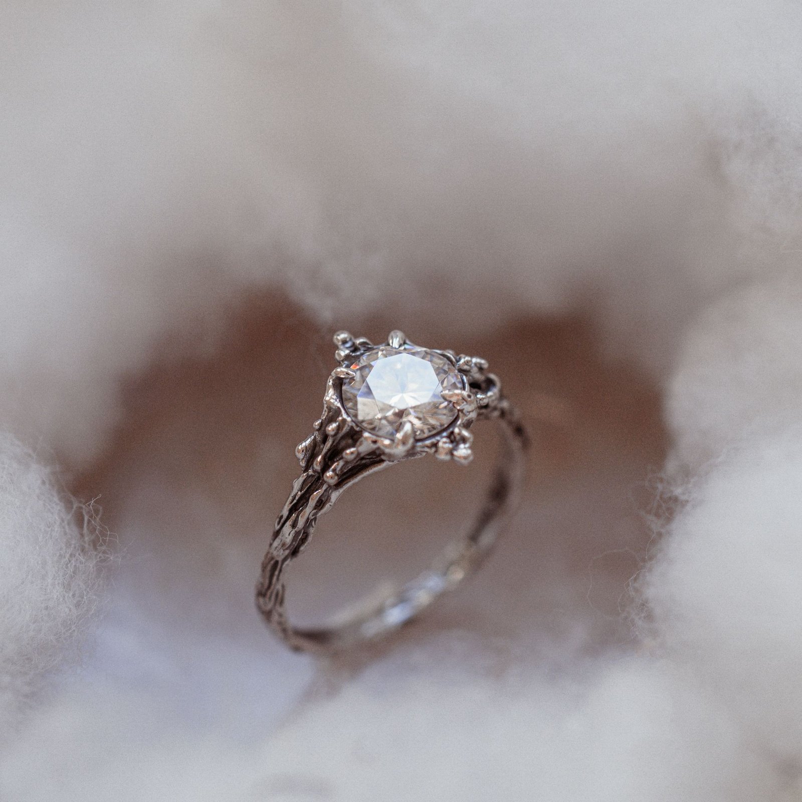 Handgefertigter Silberring mit 7 mm Moissanit. In Wachs modelliert und in 925er Sterlingsilber gegossen. Ein Unikat mit organischer Form.