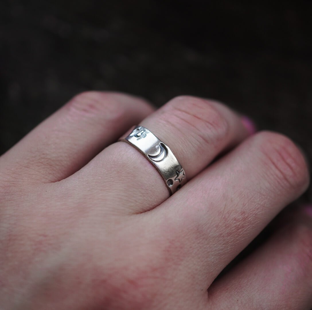 - Symbolik: Sterne und Mond symbolisieren Träume und Geheimnis, während Spinnennetz und Spinne dem Ring einen mystischen Charme verleihen.
