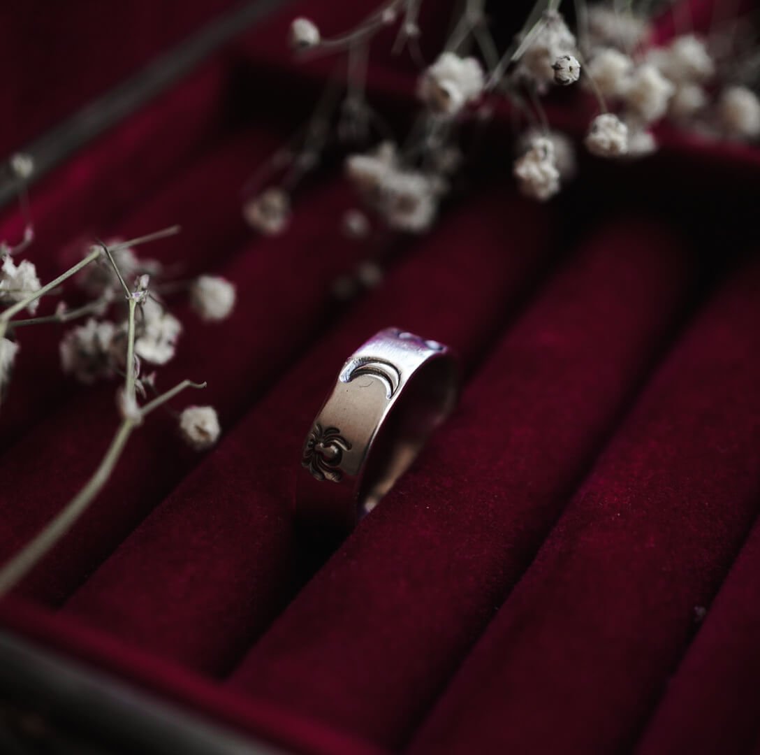 Füge diesen Silberring deiner Sammlung hinzu, der dich in die Welt magischer Nächte und geheimnisvoller Geschichten entführt.