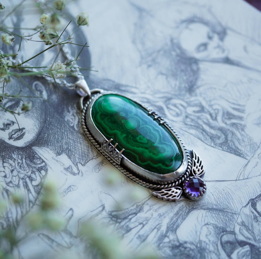 Das Hauptelement der Halskette ist ein zartes Blattmotiv, das sorgfältig ausgeschnitten wurde und diesem einzigartigen Schmuckstück besonderen Charme und Subtilität verleiht. Malachit, bekannt für seine schützenden und heilenden Eigenschaften, vereint sich mit Amethyst, der Ruhe und Gedankenklarheit symbolisiert.
