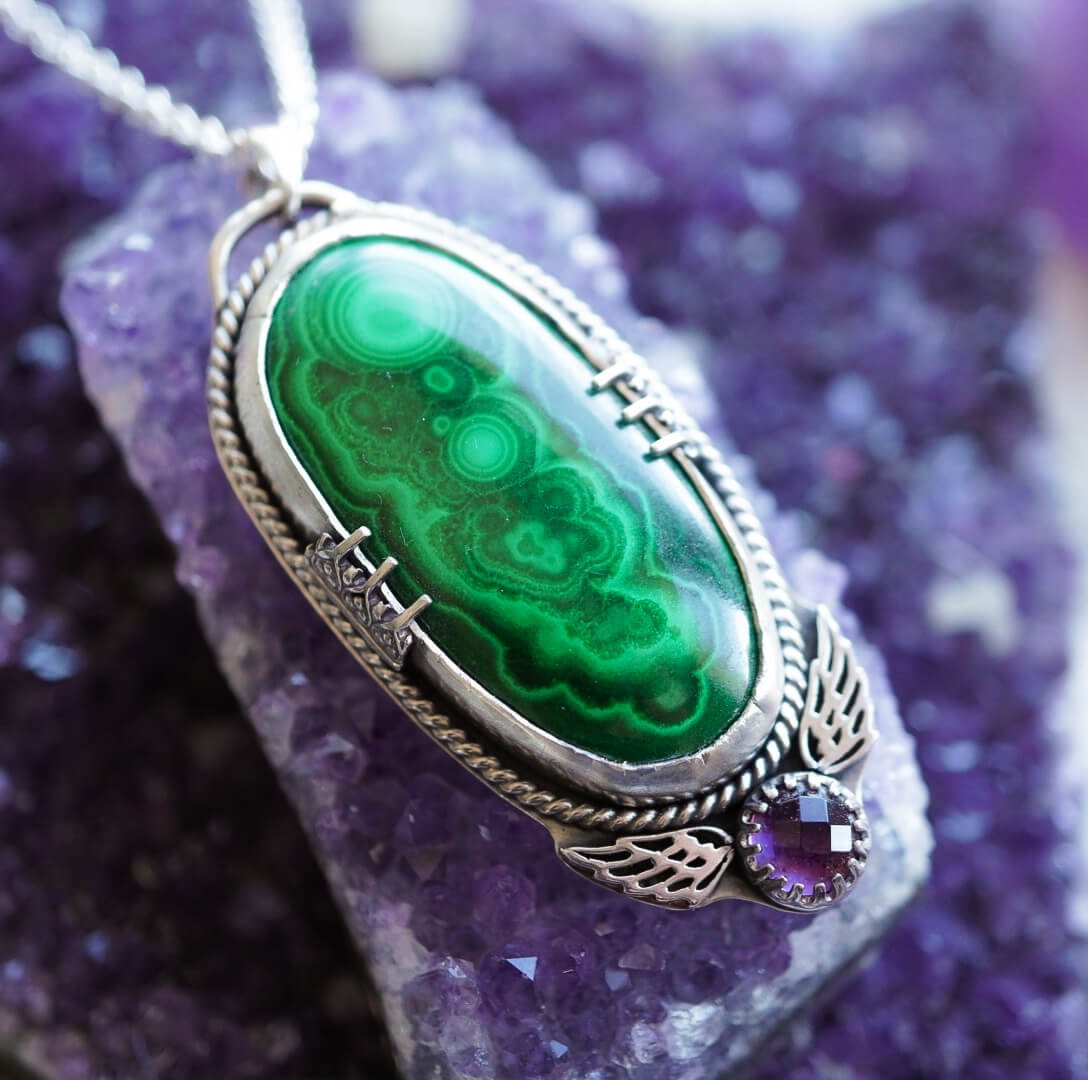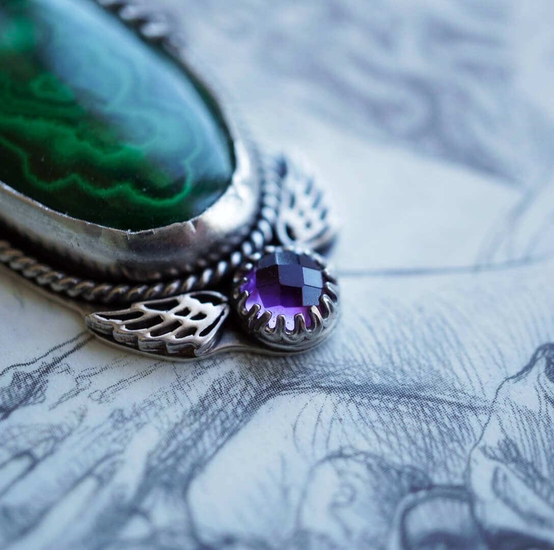 Genieße die Nähe zur Natur und füge deiner Schmucksammlung einen einzigartigen Akzent hinzu mit unserer Silberhalskette mit Malachit und Amethyst.