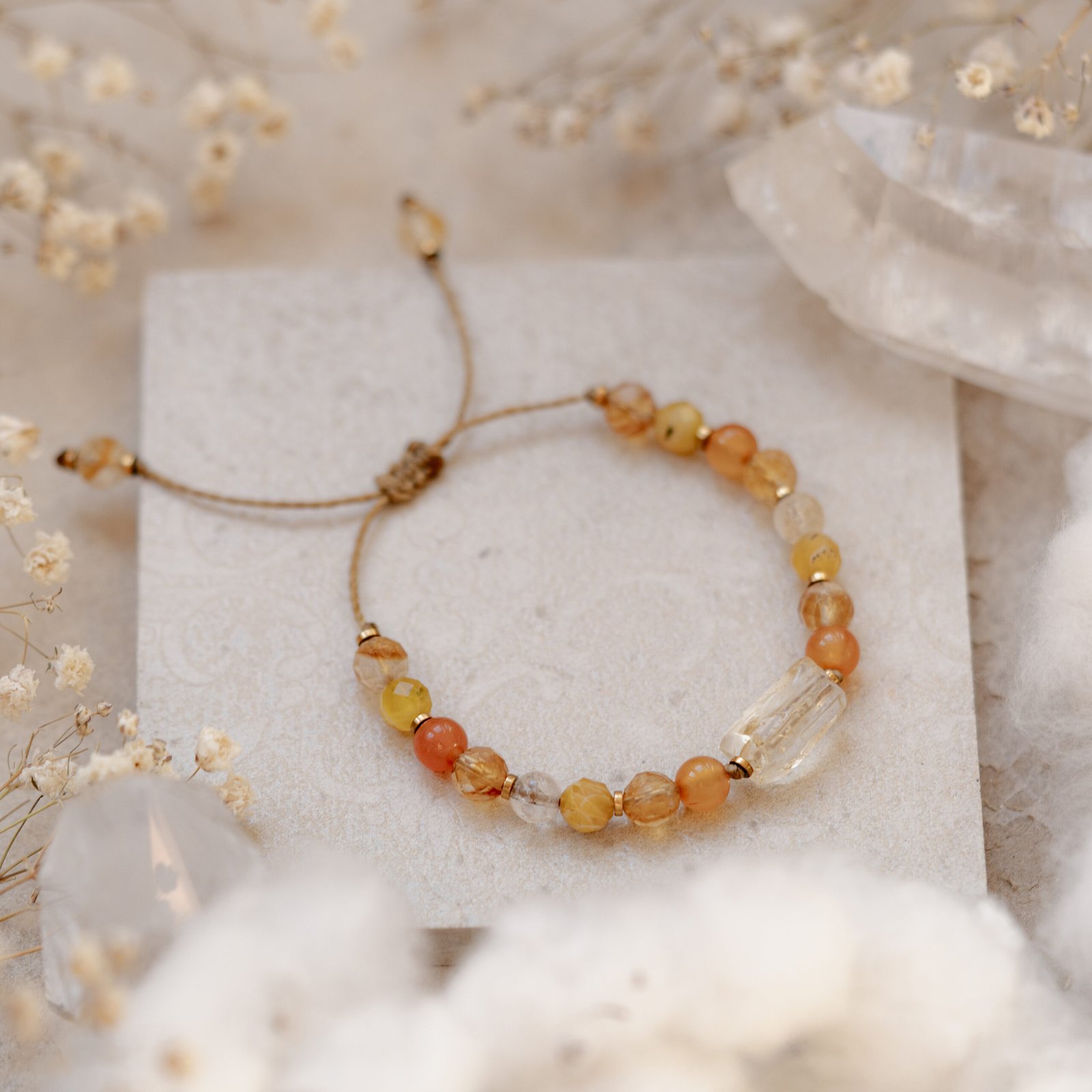 Citrine and Carnelian Bracelet – for energy and good mood was created for those who love warm, natural colors and stones that add a touch of lightness. It’s a delicate model on an adjustable cord, combining citrine, carnelian, yellow opal, and hematite. Together, they create a composition that supports optimism, action, and daily clarity. This citrine and carnelian bracelet works well if you want to add a bit of energy without overdoing it.
