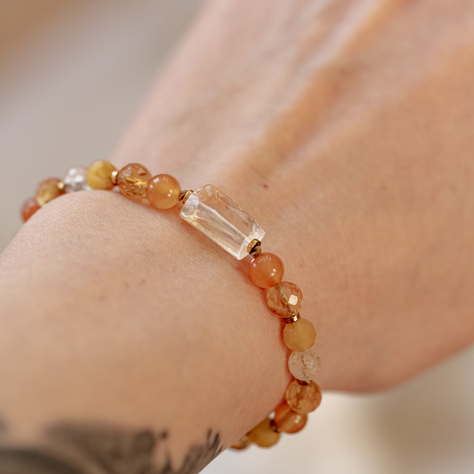 Yellow opal balances the whole and brings calm. Its creamy color softens the intensity of carnelian. This keeps the bracelet from being too ‘fiery’ – it maintains a natural softness.