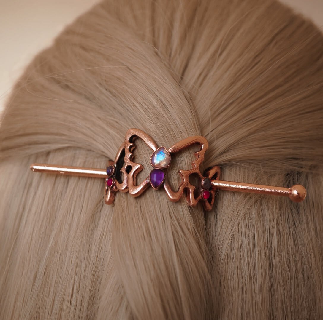 Elegant butterfly pin adorned with moonstone, amethyst, labradorite and fuchsia agate. Each stone adds its unique radiance: moonstone emanates subtle light, amethyst brings peace, labradorite spectacularly changes colors, and fuchsia agate adds energy. Perfect for creating a delicate, magical accent in your hair.