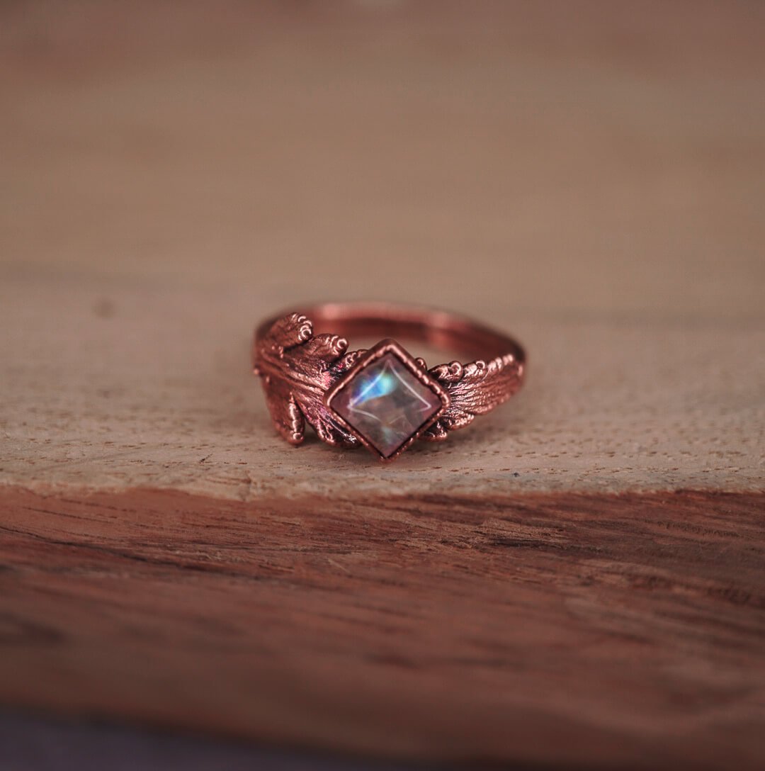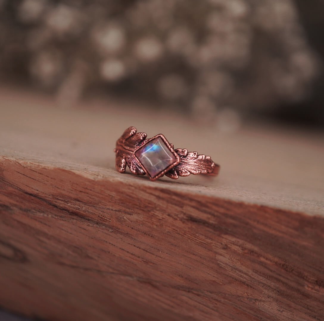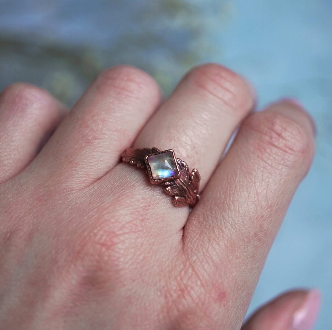 Handcrafted fern leaf ring with an iridescent moonstone, symbolizing intuition and peace. Size 15, inner diameter: 17.3 mm.