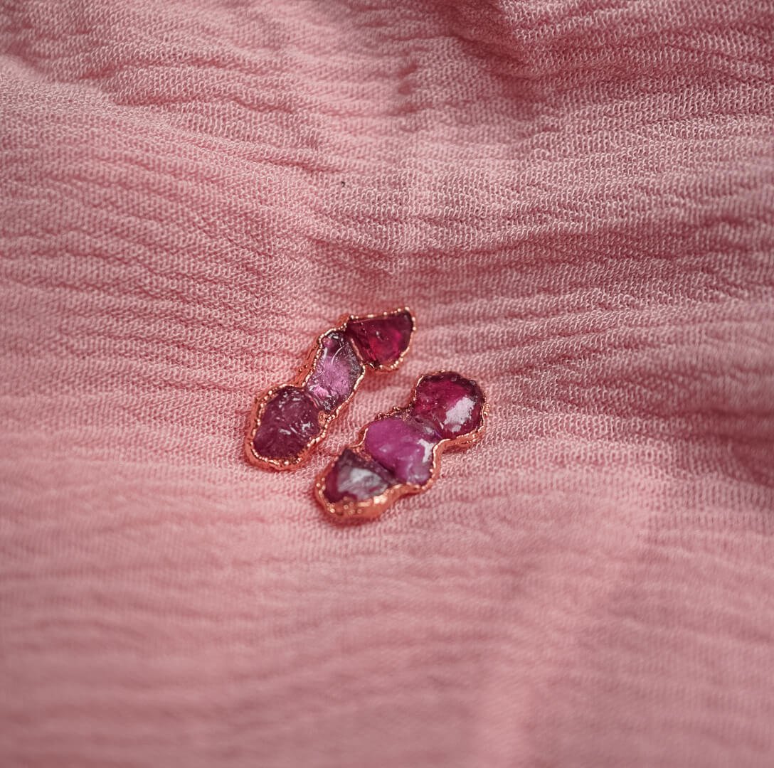 The copper setting highlights the warm, rustic character of the ruby while emphasizing its rawness. This combination of raw stone and warm metal creates a unique harmony that will make these earrings stand out in any outfit – from casual to more elegant.