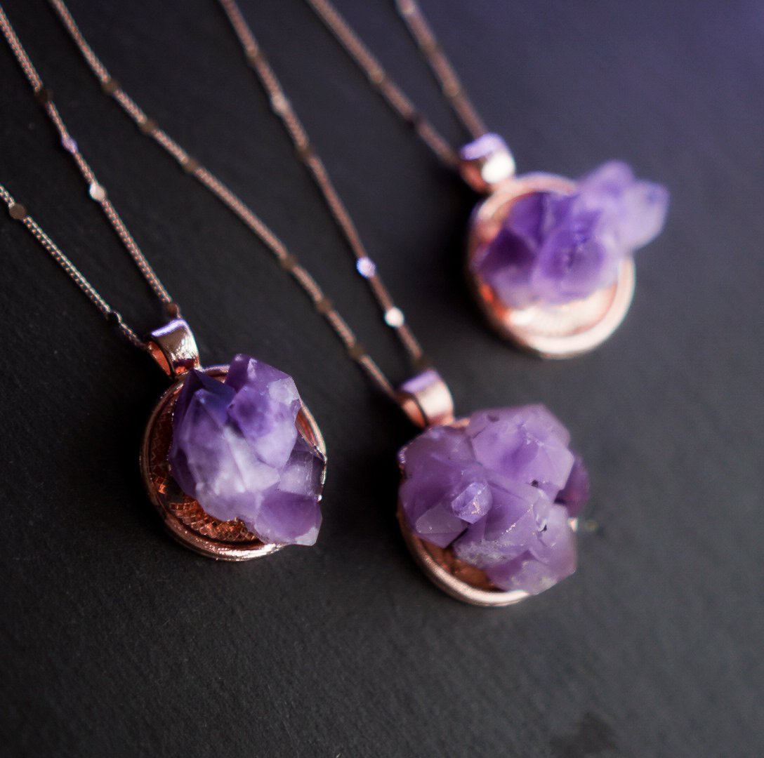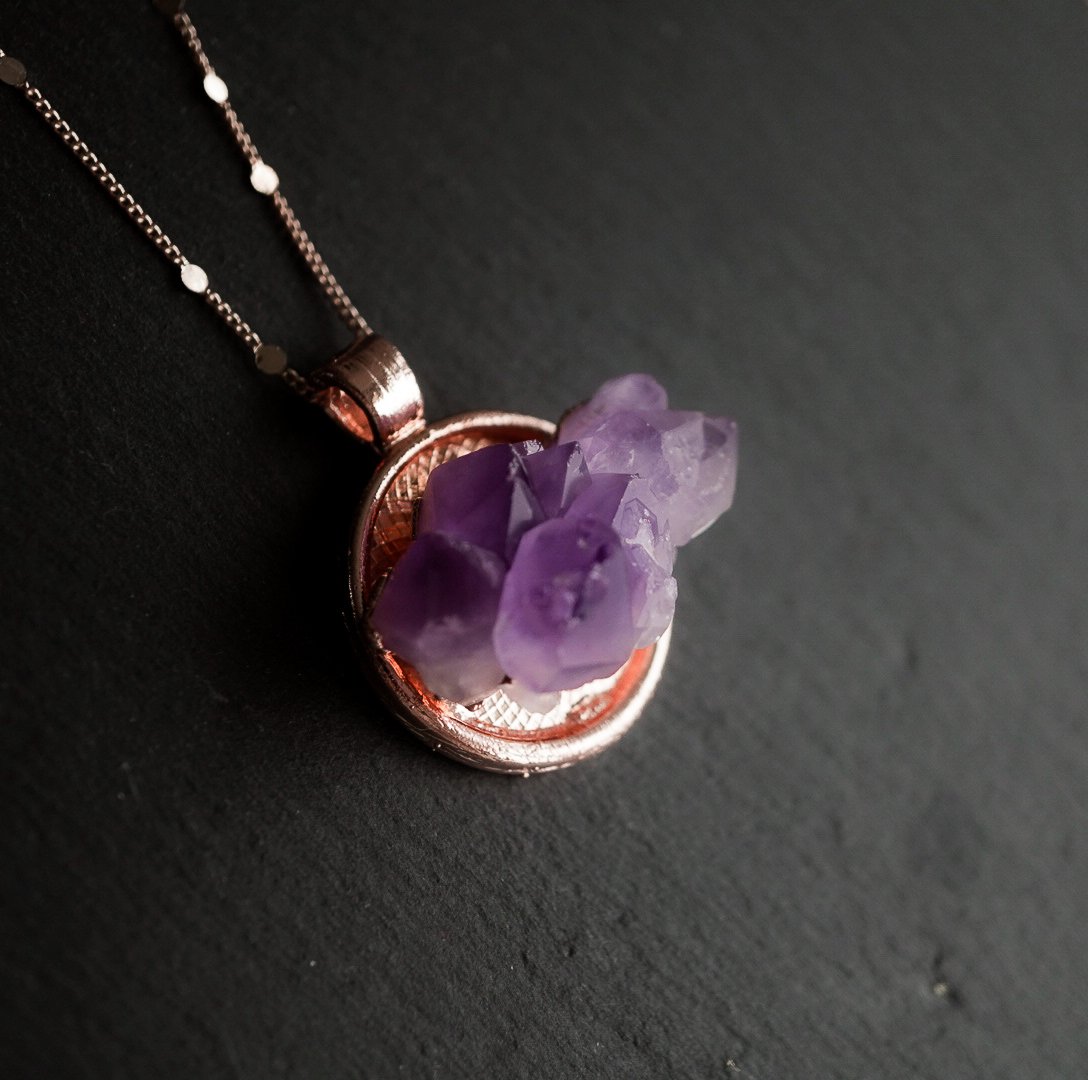 This raw Amethyst necklace is a unique accessory with an uncut, violet stone. Its natural beauty is highlighted by a copper setting, giving it an elegant look. Amethyst is associated with tranquility and protection. This versatile necklace, perfect for both minimalist and ornate styles, makes an ideal gift for those who appreciate natural stone beauty. Wear it to enhance your style and benefit from Amethyst's positive influence on emotional balance.