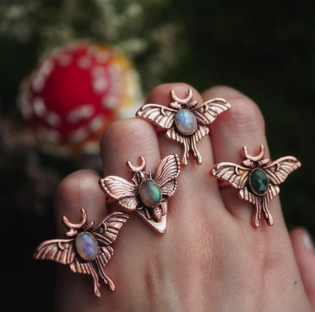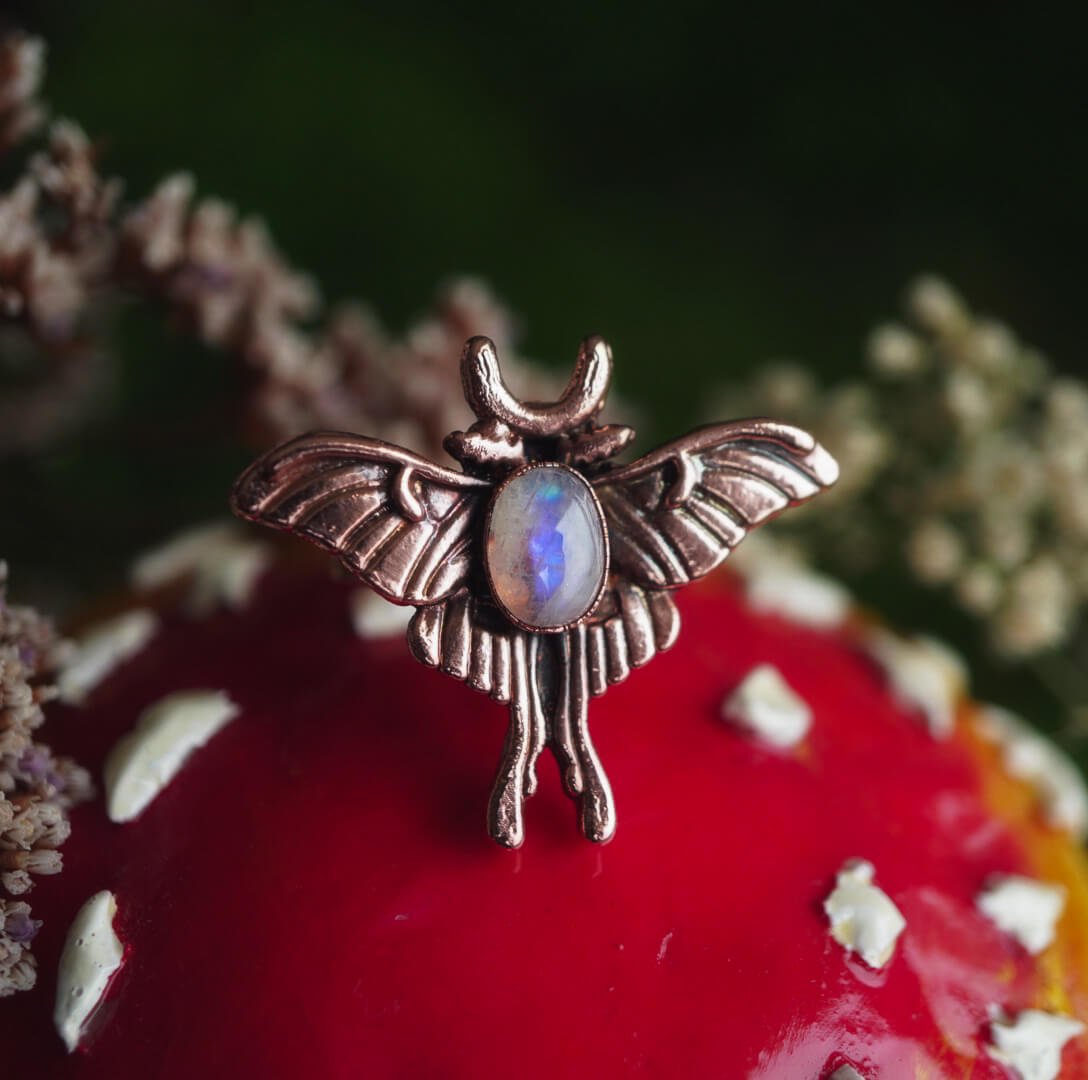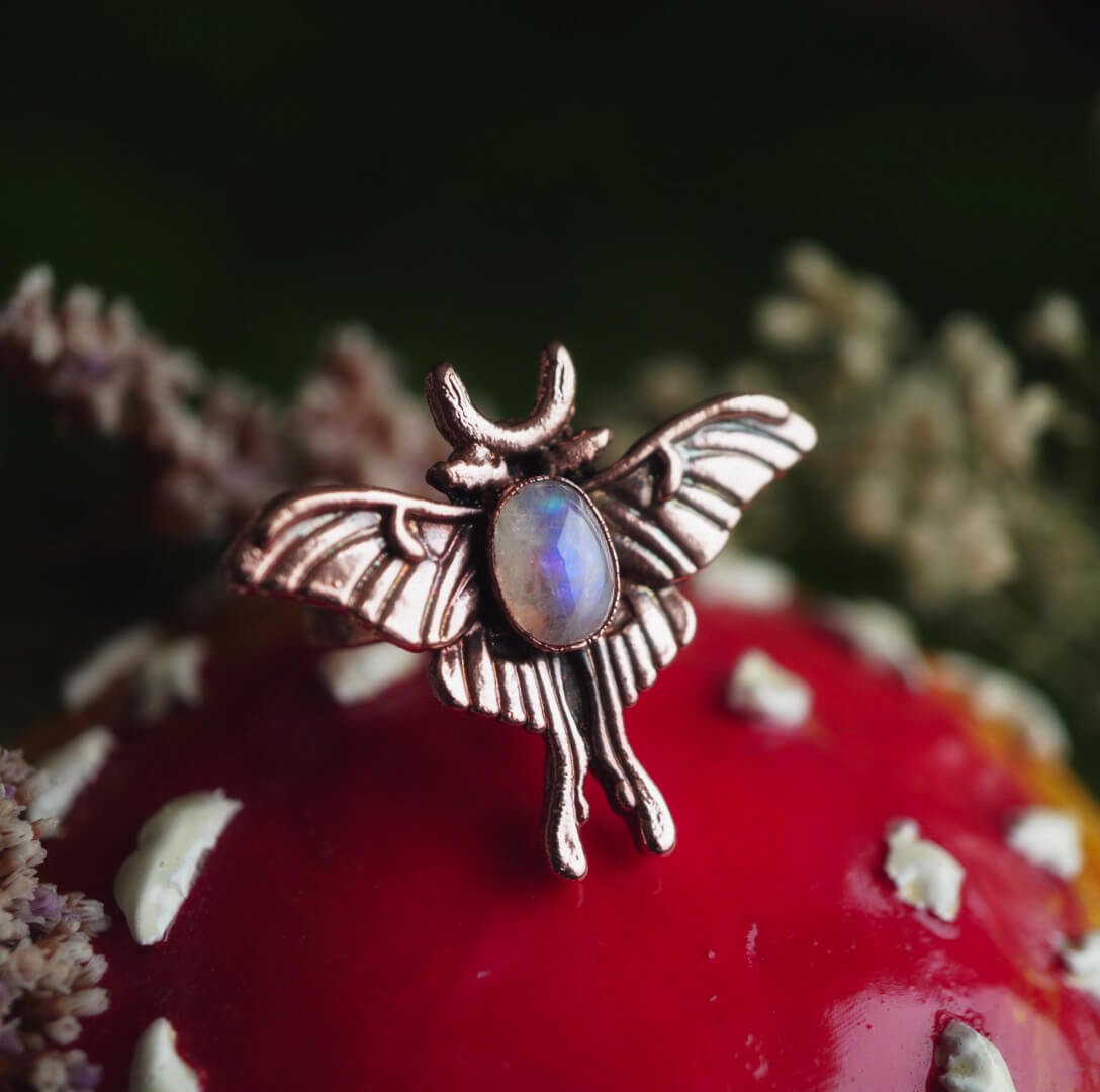 This unique size 14 copper ring captivates with its refined design. It features an intriguing moth motif, symbolizing transformation and mystery, adding depth and character to the piece. The heart of the ring is adorned with a moonstone, known for its shimmering, unique reflections reminiscent of moonlight. This stone, encircled by the warm luster of copper, not only catches the eye but is also considered a talisman of intuition and balance.