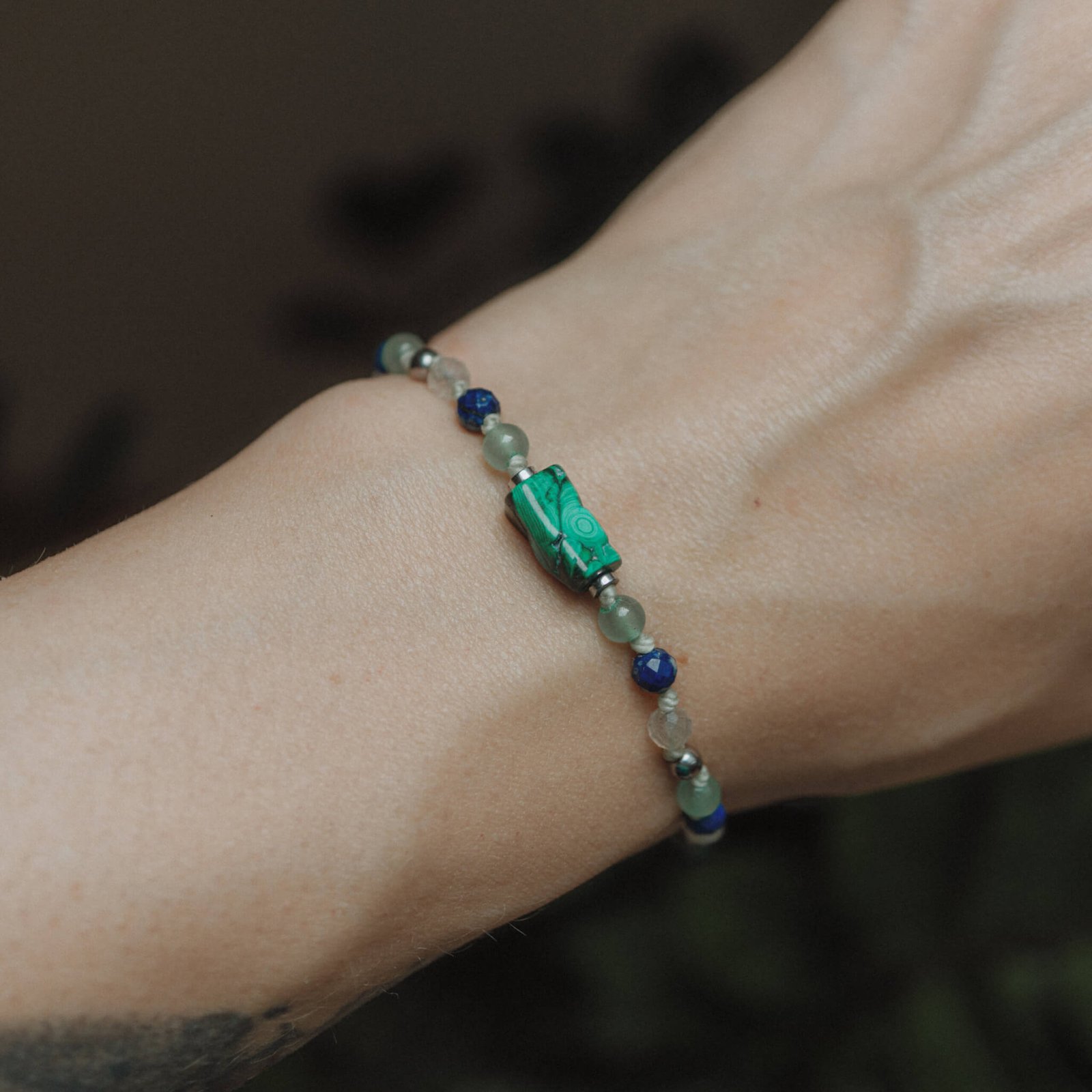 The colors combine green, navy blue, and steel gray – inspired by the forest, earth, and twilight sky. This malachite bracelet doesn’t just adorn. It also helps you feel calm and remember your own strength.