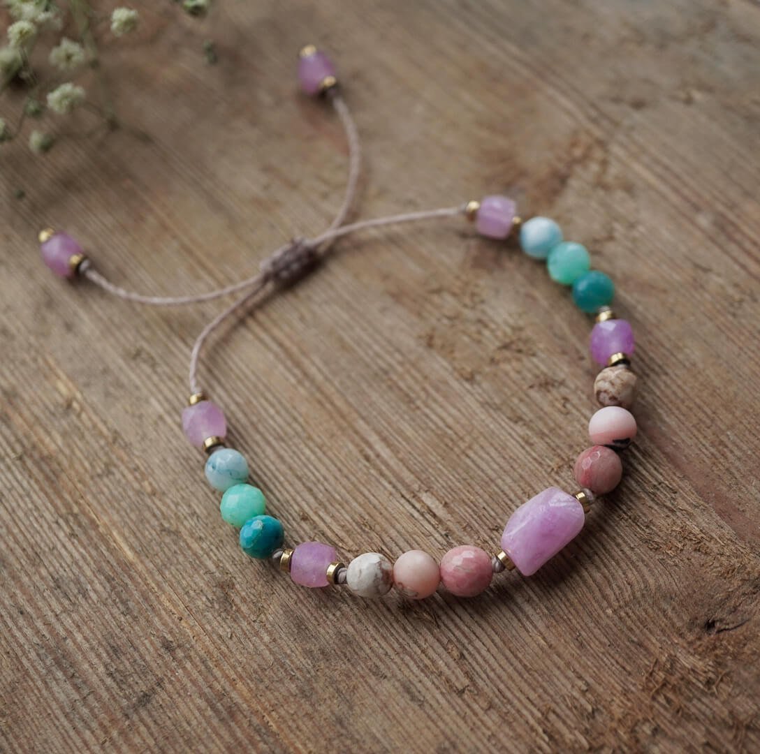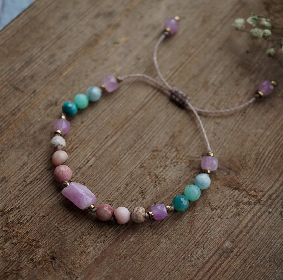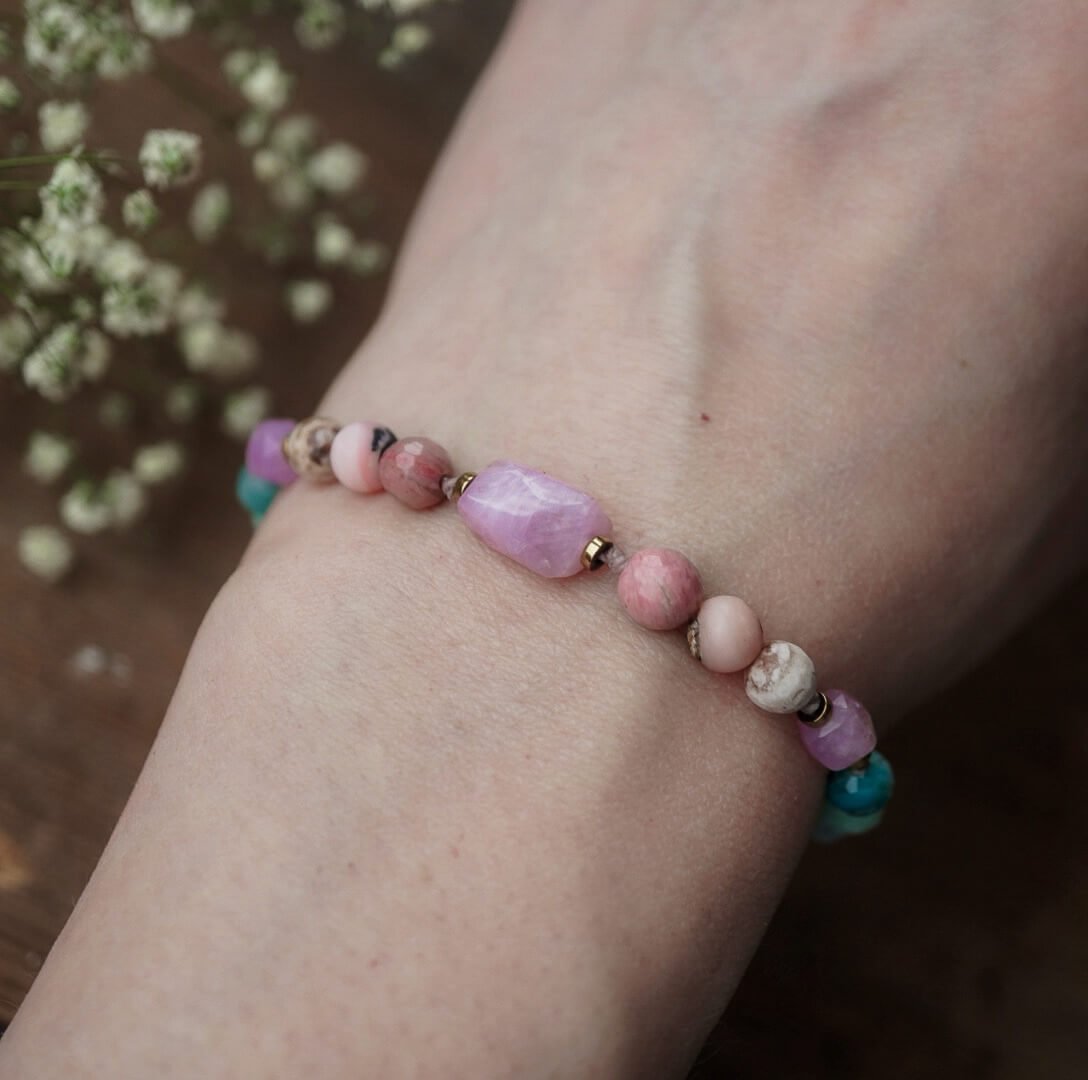 A delicate bracelet with kunzite, rhodonite, and natural stones supports emotional balance, intuition, and relationships. Ideal jewelry for sensitive and empathetic individuals.