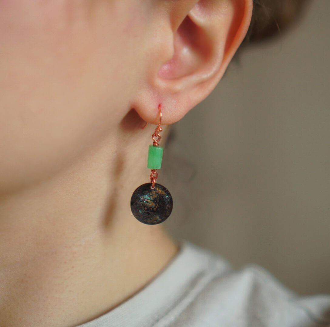Each pair is crafted with attention to detail, highlighting the uniqueness of these natural earth-given stones. Lightweight, they ensure all-day comfort. Over time, the copper oxidizes, giving the jewelry a unique, vintage character that beautifully contrasts with the intense green of chrysoprase.