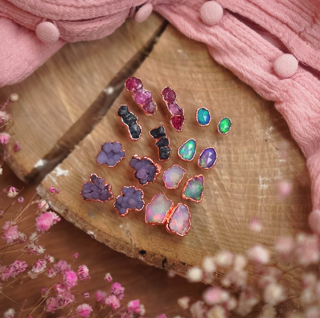 These Magical Grape Agate Studs in Copper are jewelry that reminds you of the harmony and peace flowing from nature, adding subtle magic to every day.