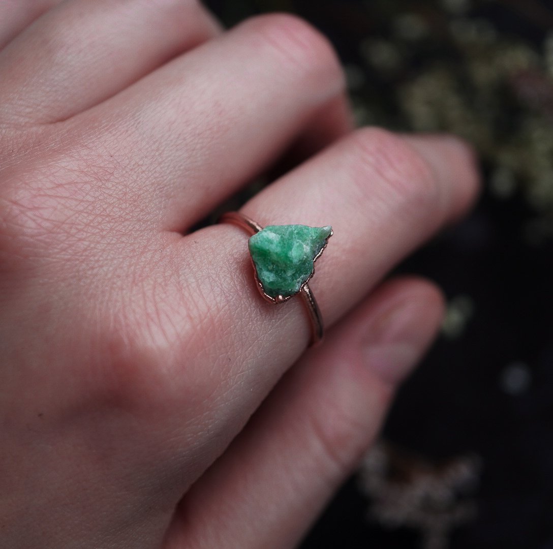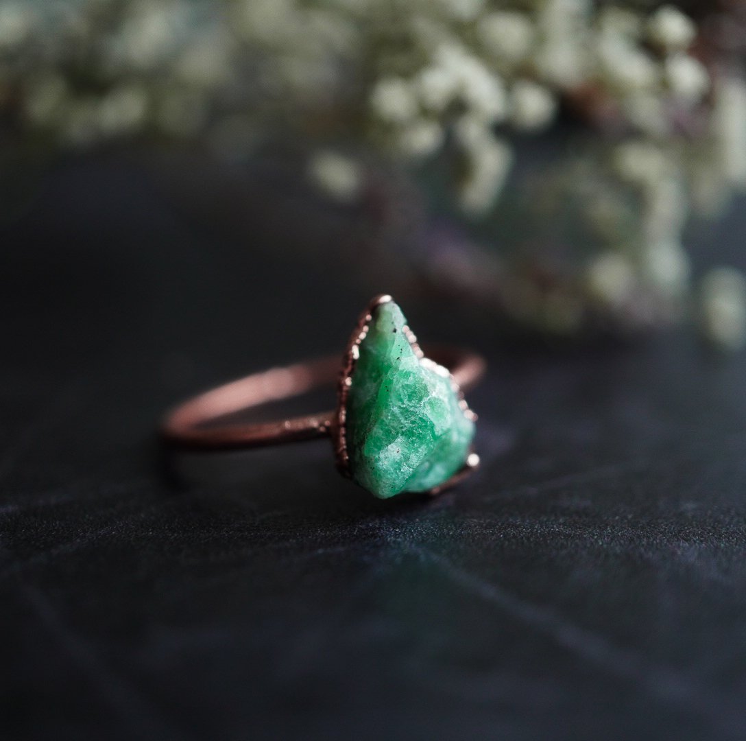 This raw Emerald ring, set in copper, is unique jewelry that highlights the stone's natural beauty. The raw green Emerald adds character, while the surrounding copper gives it a rustic look. This blend of raw stone and metal creates an original, natural design.