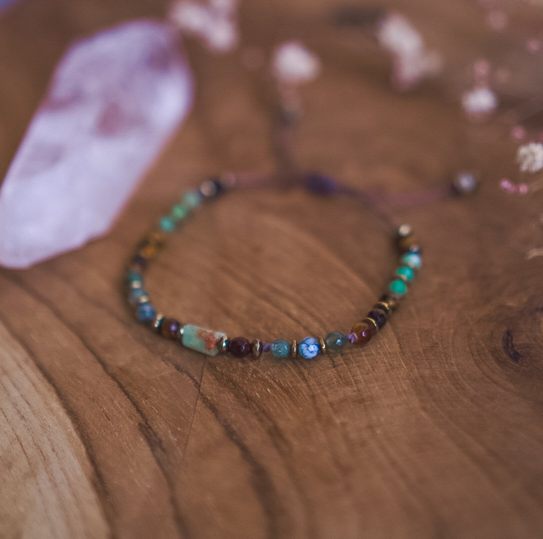 This unique bracelet combines the power of four natural stones to bring harmony and protection into your life. Chrysoprase adds heart energy and strengthens emotional balance. Tiger's Eye provides self-confidence and repels negative influences. Moss Agate promotes calm and emotional stability, while Hematite adds vital force and strengthens the body. It's a bracelet that combines nature with energy, creating a harmonized and protective amulet for your wrist.