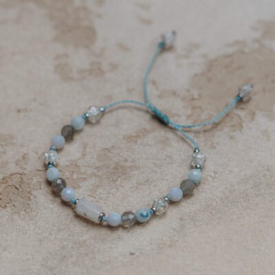 Bransoletka z kamieniem księżycowym, kryształem górskim, jadeitem i labradorytem. Naturalne kamienie, eteryczny styl i energia wspierająca intuicję i spokój.