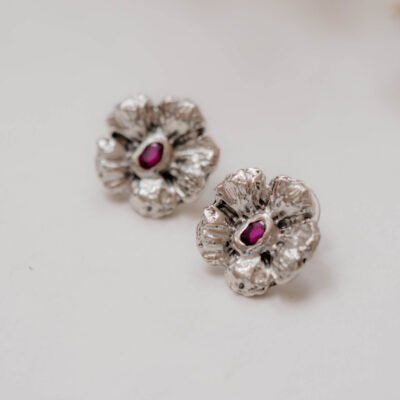Ręcznie robione kolczyki ze srebra próby 925 z naturalnymi rubinami, inspirowane kwiatami. Delikatne w formie, wyraziste w charakterze – biżuteria z duszą, której nie da się powtórzyć.