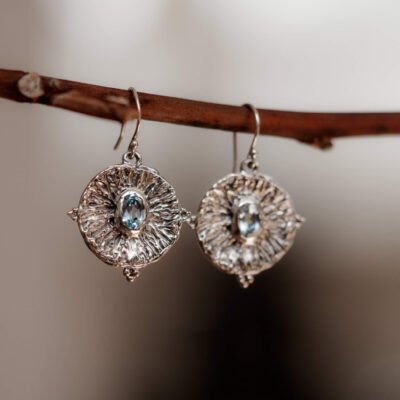 Kolczyki ze srebra z naturalnymi topazami Sky Blue, ręcznie wykonane z dołączonymi silikonowymi zatyczkami – lekkie i unikalne.