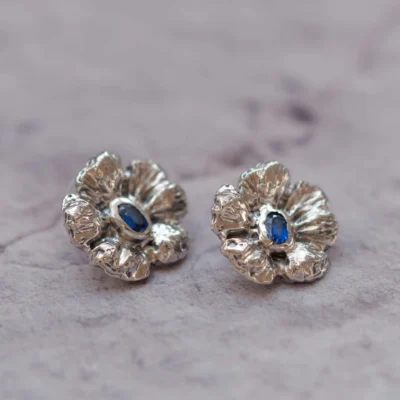 Ręcznie robione srebrne kolczyki w formie kwiatów, z naturalnym kyanitem o intensywnej, niebieskiej barwie.