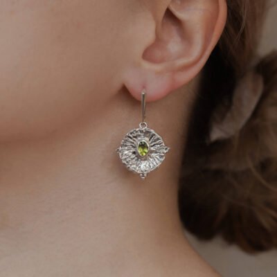 Srebrne kolczyki z peridotem, uformowane ręcznie w wosku i odlane metodą traconego wosku. Połączenie organicznej faktury srebra i zielonego kamienia tworzy unikalną, magiczną biżuterię.