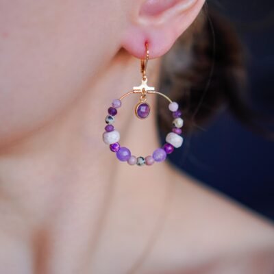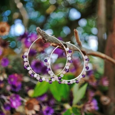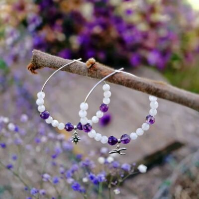 Kolczyki Nocne Tajemnice łączą ametyst i kamień księżycowy, tworząc ochronny duet dla intuicji, spokoju i głębokiego ukojenia.