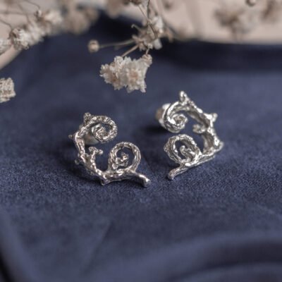 Ręcznie wykonane kolczyki ze srebra 925 inspirowane naturą. Model „Leśna Gałązka” powstał metodą rzeźbienia w wosku i odlewu w srebrze. Lekka forma, unikatowy charakter, baśniowy styl.