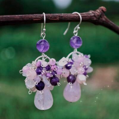 Kolczyki Światło Księżyca – srebro 925, kamień księżycowy, ametyst i kwarc różowy. Biżuteria dla kobiet ceniących intuicję, energię i lekkość formy.