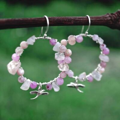 Subtelne kolczyki ze srebra próby 925 z naturalnymi kamieniami: kwarcem różowym, kunzytem, opalem i jadeitem. Ozdobione zawieszką kwiatu lotosu.