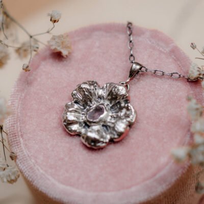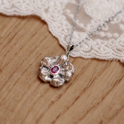Ręcznie wykonany naszyjnik ze srebra próby 925 z naturalnym rubinem, inspirowany kwiatem – delikatny, wyrazisty i pełen symboliki. Idealny dla kobiet, które cenią wyjątkową biżuterię z charakterem.