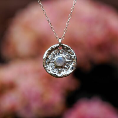 Unikatowy srebrny naszyjnik z kamieniem księżycowym, inspirowany światłem i czułością wobec niedoskonałości. Ręcznie rzeźbiona forma w kształcie promiennego amuletu przypomina o tym, że światło mamy w sobie – nawet gdy niebo jest zachmurzone.