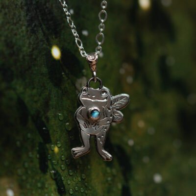 Srebrny naszyjnik z kamieniem księżycowym w formie żabki, wykonany ręcznie ze srebra próby 925. Delikatna, bajkowa forma z subtelnym blaskiem kamienia w brzuszku. Biżuteria z charakterem, lekkością i nutą humoru.