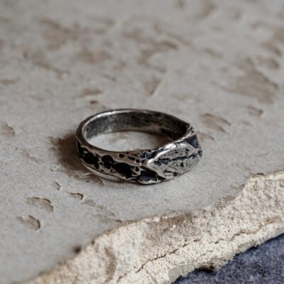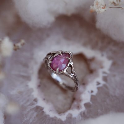 Ręcznie tworzony pierścionek srebrny z ametystem, który łączy organiczny kształt i baśniowy fiolet kamienia w jedną wyjątkową, romantyczną formę.