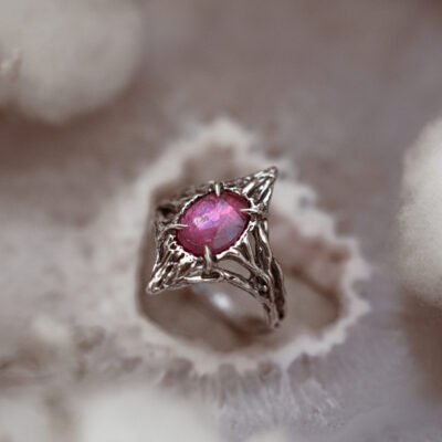 Ręcznie wykonany srebrny pierścionek z naturalnym różowym turmalinem. Rzeźbiony w wosku i odlany w srebrze próby 925. Unikatowy egzemplarz o organicznej formie.