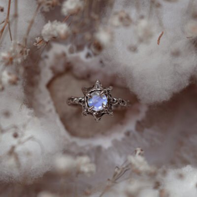 Ręcznie formowany pierścionek srebrny z kamieniem księżycowym w rozmiarze 14,5. Organiczna, jedyna w swoim rodzaju forma i chłodny, świetlisty blask kamienia.